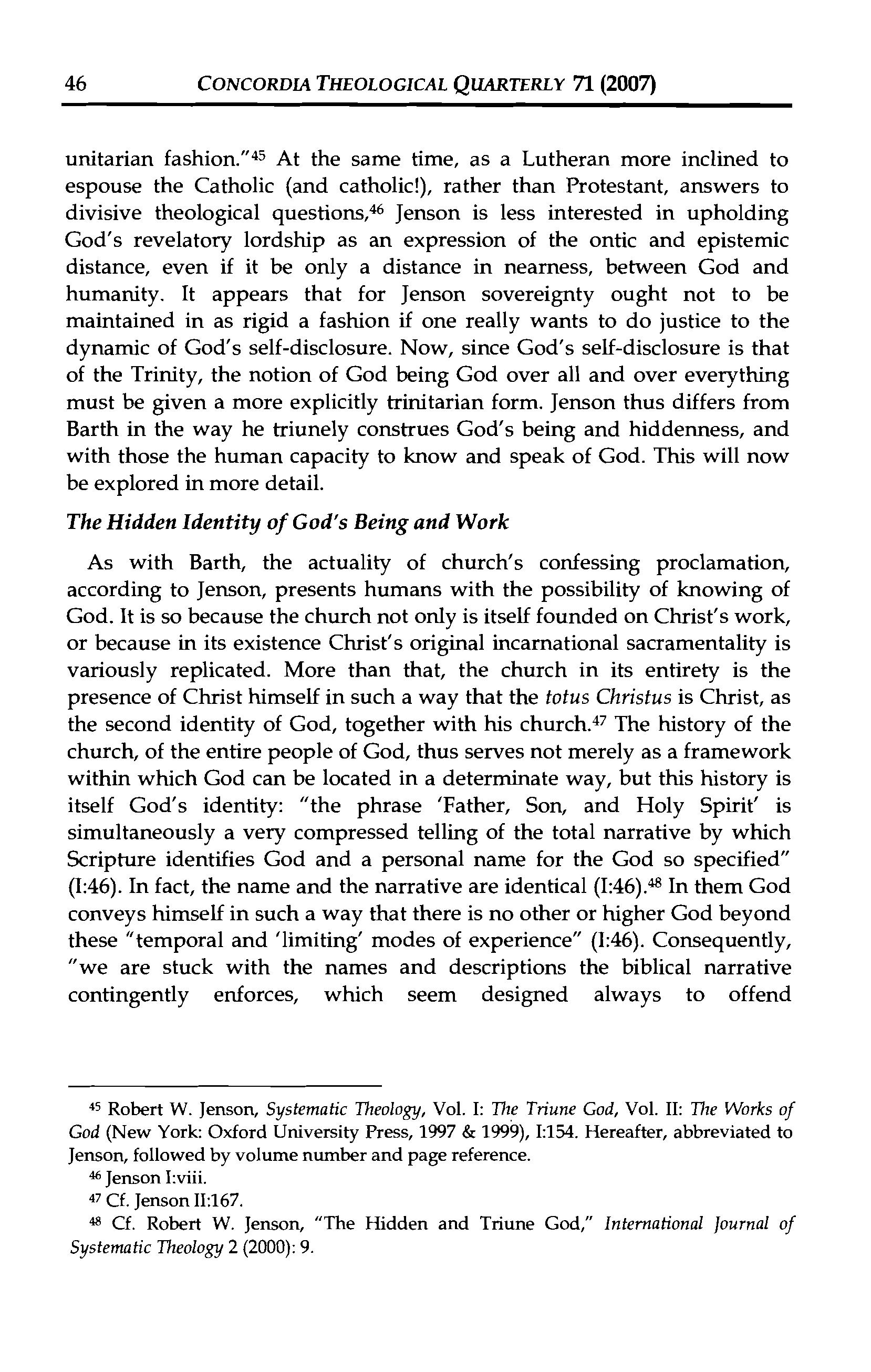 45 Robert W. Jenson, Systematic Theology, Vol. I: l71e Triune God, Vol. 11: l71e Works of God (New York: Oxford University Press, 1997 & 1999), I:154. Hereafter, abbreviated to Jenson, followed by volume number and page reference.