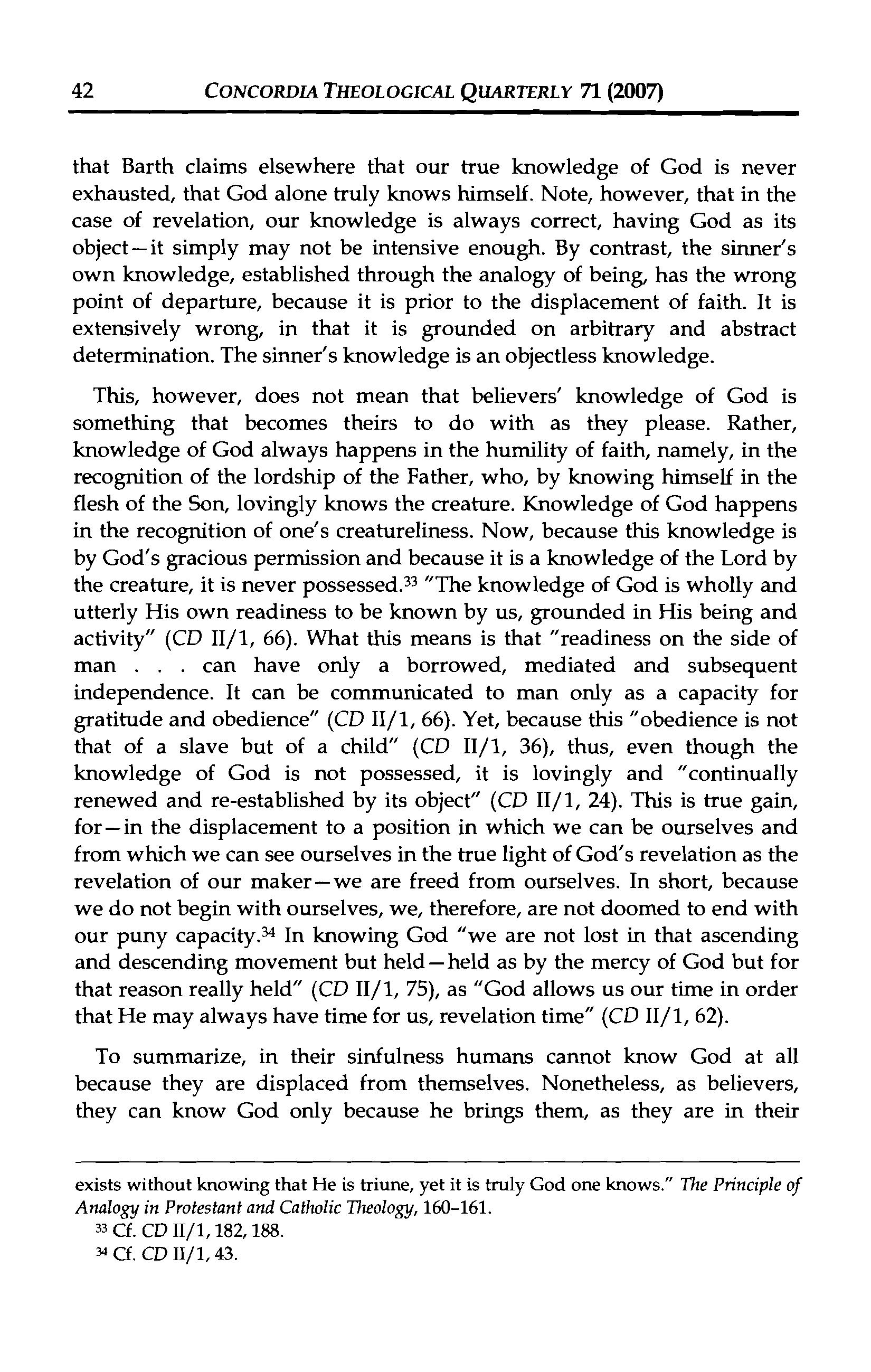 that Barth claims elsewhere that our true knowledge of God is never exhausted, that God alone truly knows himself. Note, however, that in the case of revelation, our knowledge is always correct, having God as its object-it simply may not be intensive enough. By contrast, the sinner's own knowledge, established through the analogy of being, has the wrong point of departure, because it is prior to the displacement of faith. It is extensively wrong, in that it is grounded on arbitrary and abstract determination. The sinner's knowledge is an objectless knowledge.
