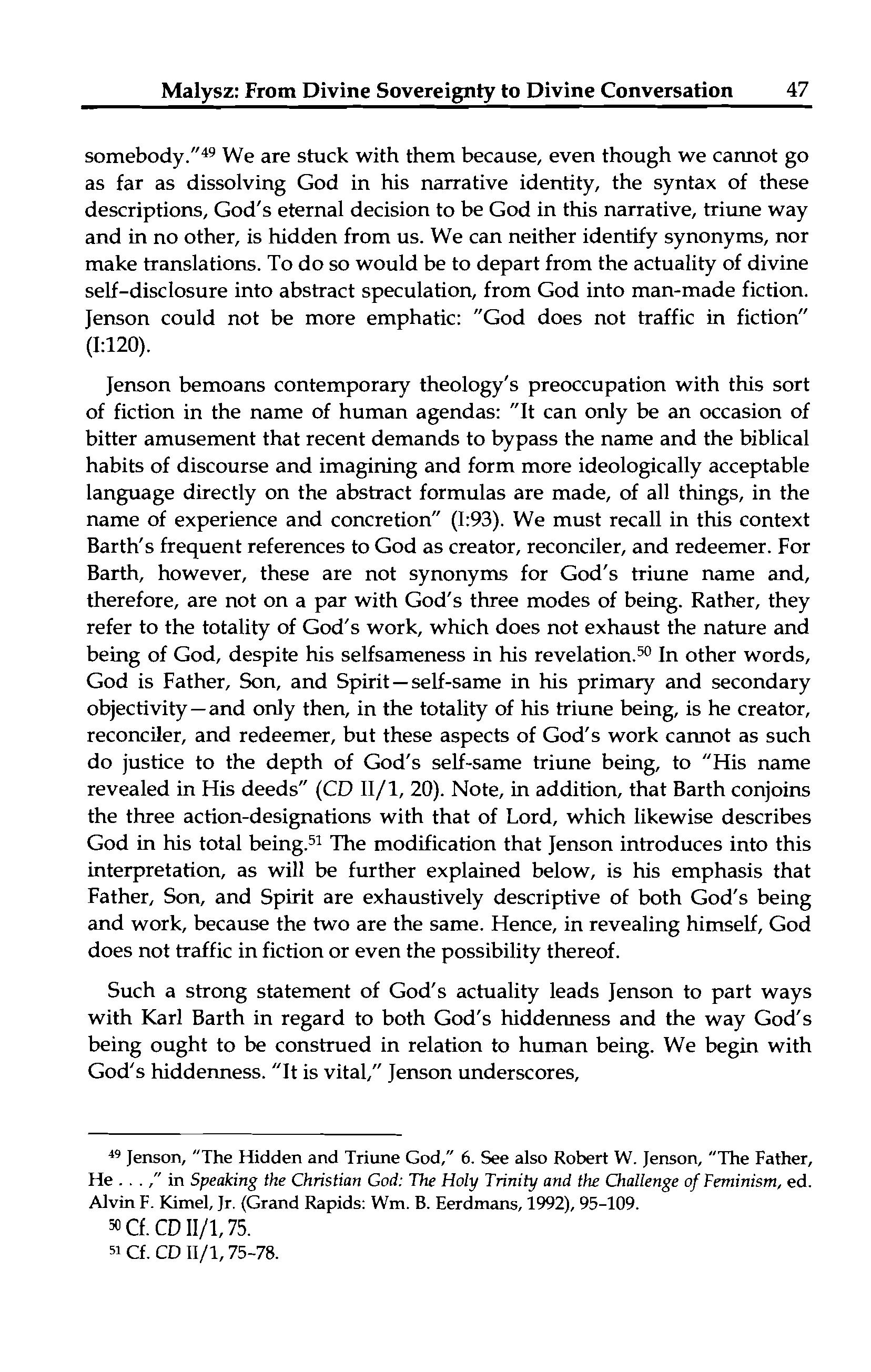somebody."49 We are stuck with them because, even though we cannot go as far as dissolving God in his narrative identity, the syntax of these descriptions, God's eternal decision to be God in this narrative, triune way and in no other, is hidden from us. We can neither identify synonyms, nor make translations. To do so would be to depart from the actuality of divine self-disclosure into abstract speculation, from God into man-made fiction. Jenson could not be more emphatic: "God does not traffic in fiction" (1:lZO).
