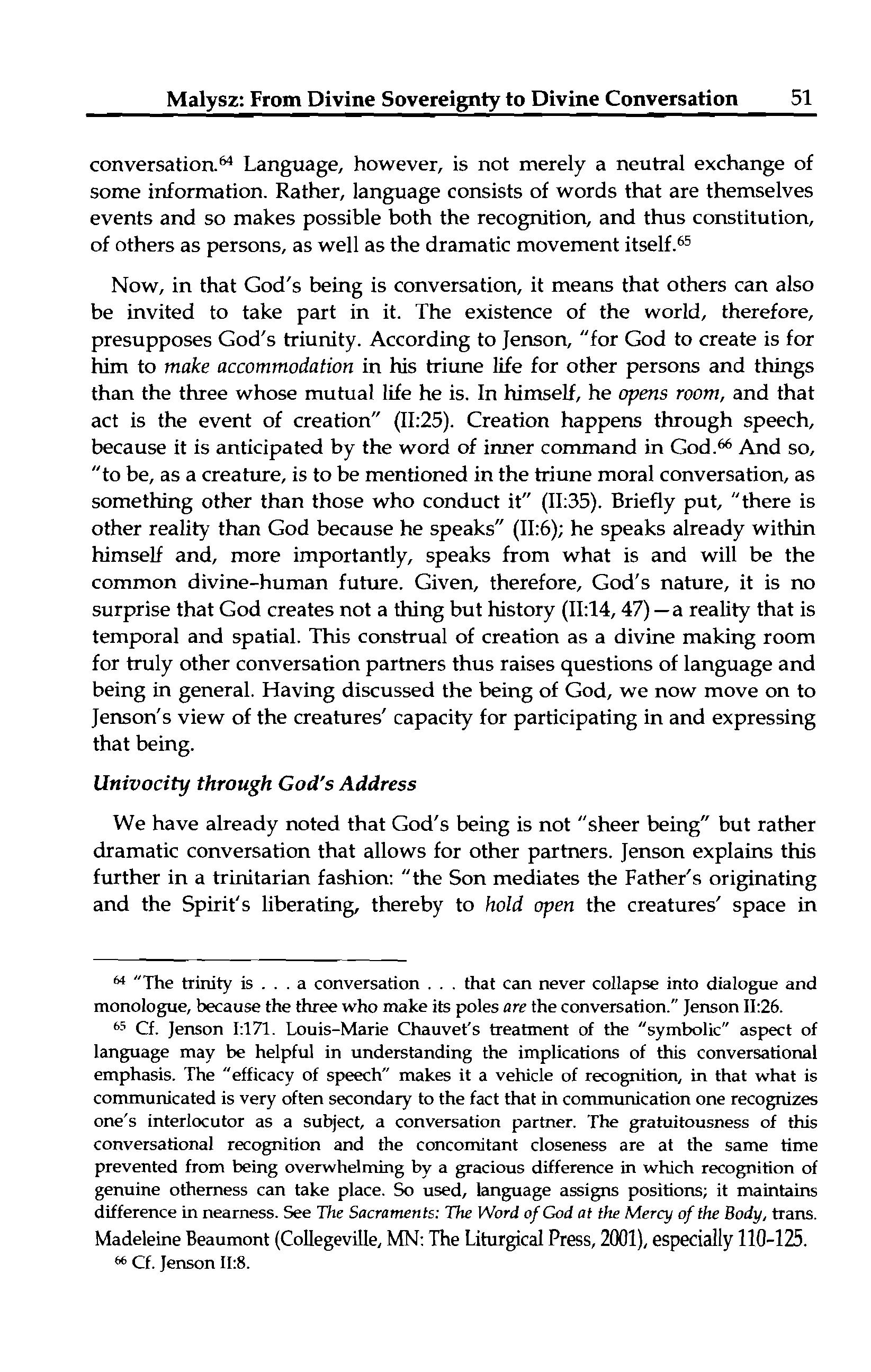 65 Cf. Jenson I:l7l. Louis-Marie Chauvet's treatment of the "symbolic" aspect of language may be helpful in understanding the implications of this conversational emphasis. The "efficacy of speech makes it a vehicle of recognition, in that what is communicated is very often secondary to the fact that in communication one recognizes one's interlocutor as a subject, a conversation partner. The gratuitousness of this conversational recognition and the concomitant closeness are at the same time prevented from being overwhelming by a gracious difference in which recognition of genuine otherness can take place. &J used, language assigns positions; it maintains difference in nearness. See The Sacraments: The Word of God at the Mercy of the Body, trans. Madeleine Beaumont (Collegeville,MN. The Liturgical Press, 2001), especially 110-125.