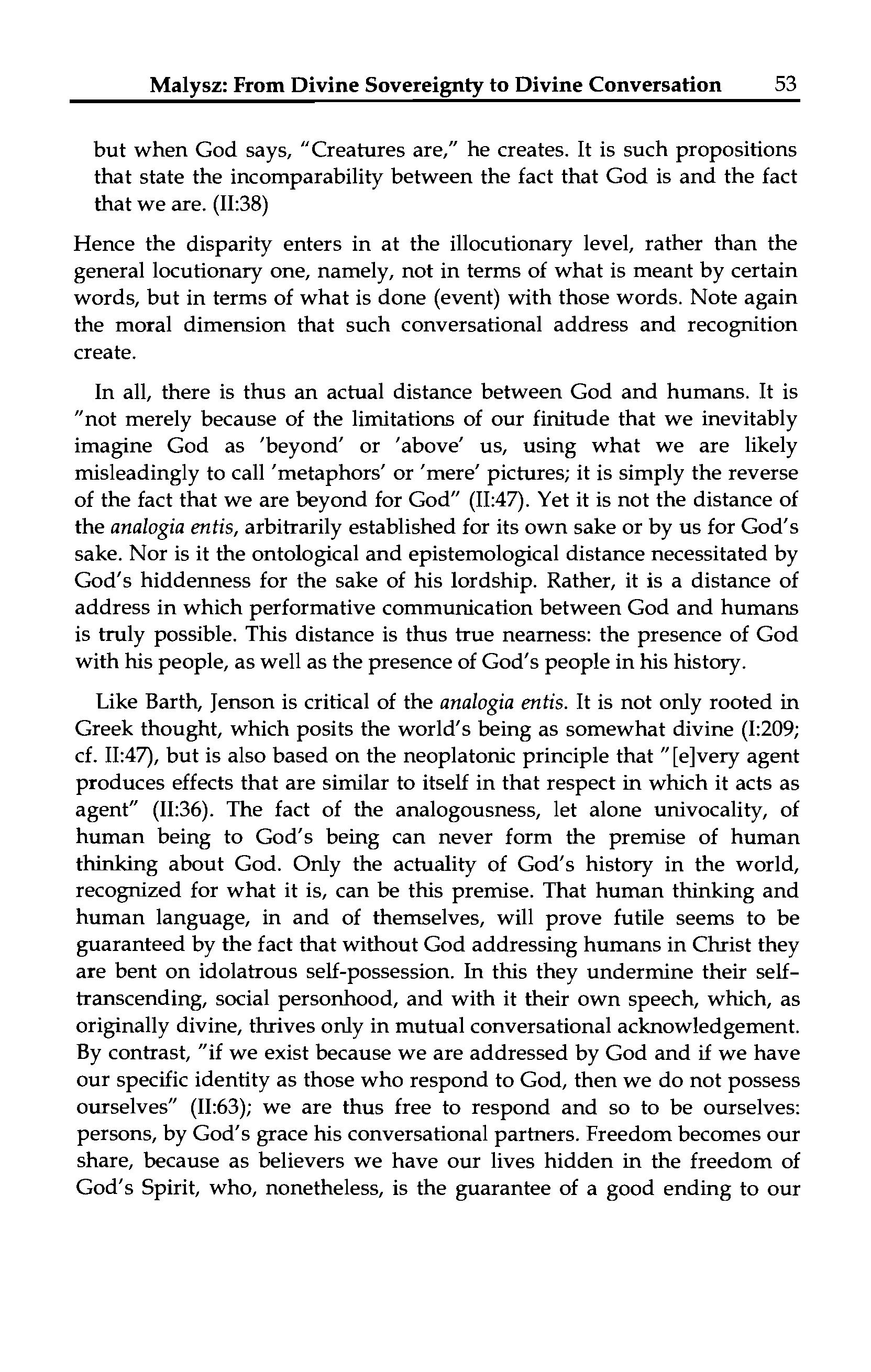 Like Barth, Jenson is critical of the analogia entis. It is not only rooted in Greek thought, which posits the world's being as somewhat divine (1:209; cf. II:47), but is also based on the neoplatonic principle that " [elvery agent produces effects that are similar to itself in that respect in which it acts as agent" (II:36). The fact of the analogousness, let alone univocality, of human being to God's being can never form the premise of human thinking about God. Only the actuality of God's history in the world, recognized for what it is, can be this premise. That human thinking and human language, in and of themselves, will prove futile seems to be guaranteed by the fact that without God addressing humans in Christ they are bent on idolatrous self-possession. In this they undermine their selftranscending, social personhood, and with it their own speech, which, as originally divine, thrives only in mutual conversational acknowledgement. By contrast, "if we exist because we are addressed by God and if we have our specific identity as those who respond to God, then we do not possess ourselves" (II:63); we are thus free to respond and so to be ourselves: persons, by God's grace his conversational partners. Freedom becomes our share, because as believers we have our lives hidden in the freedom of God's Spirit, who, nonetheless, is the guarantee of a good ending to our