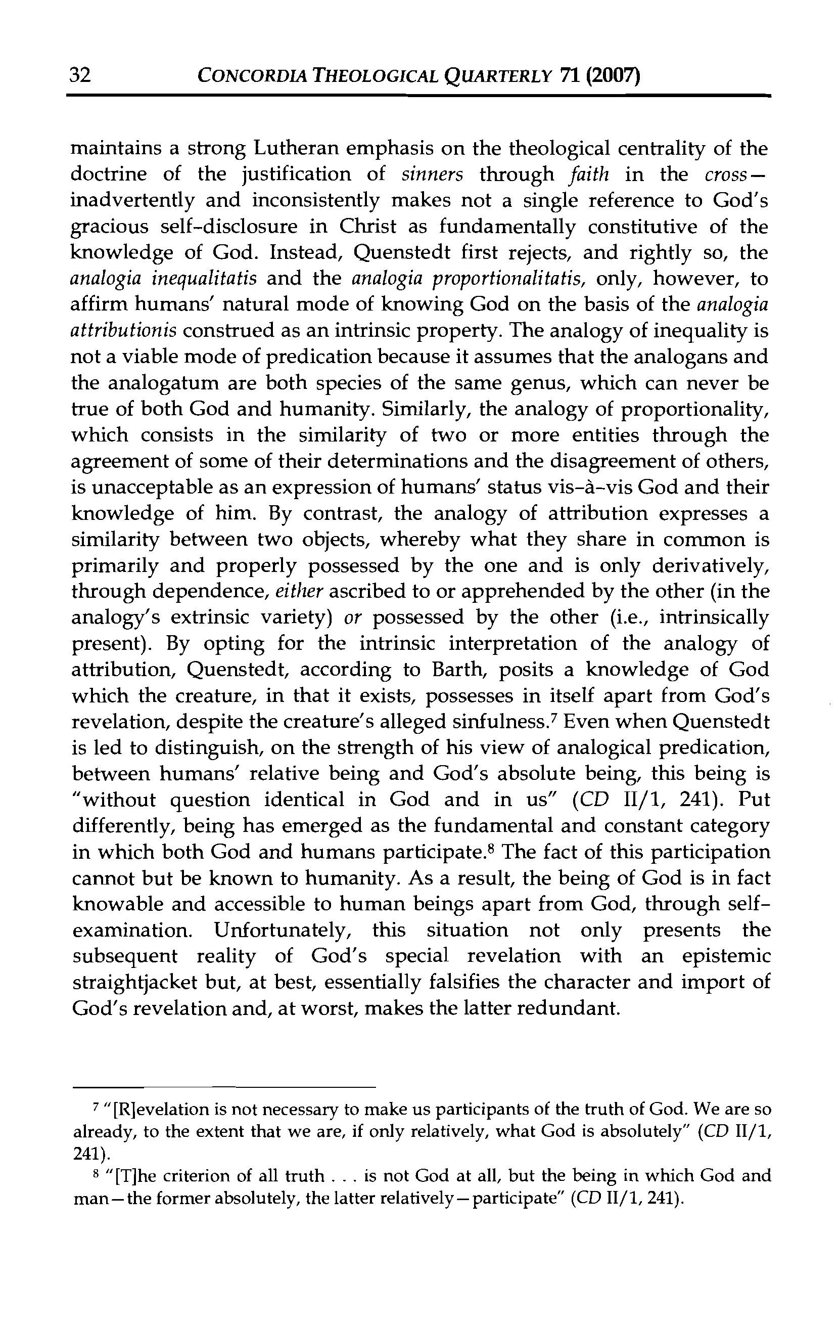 maintains a strong Lutheran emphasis on the theological centrality of the doctrine of the justification of sinners through faith in the crossinadvertently and inconsistently makes not a single reference to God's gracious self-disclosure in Christ as fundamentally constitutive of the knowledge of God. Instead, Quenstedt first rejects, and rightly so, the analogia inequalitatis and the analogia proportionalitatis, only, however, to affirm humans' natural mode of knowing God on the basis of the analogia attributionis construed as an intrinsic property. The analogy of inequality is not a viable mode of predication because it assumes that the analogans and the analogatum are both species of the same genus, which can never be true of both God and humanity. Similarly, the analogy of proportionality, which consists in the similarity of two or more entities through the agreement of some of their determinations and the disagreement of others, is unacceptable as an expression of humans' status vis-a-vis God and their knowledge of him. By contrast, the analogy of attribution expresses a similarity between two objects, whereby what they share in common is primarily and properly possessed by the one and is only derivatively, through dependence, either ascribed to or apprehended by the other (in the analogy's extrinsic variety) or possessed by the other (i.e., intrinsically present). By opting for the intrinsic interpretation of the analogy of attribution, Quenstedt, according to Barth, posits a knowledge of God which the creature, in that it exists, possesses in itself apart from God's revelation, despite the creature's alleged sinfulness.7 Even when Quenstedt is led to distinguish, on the strength of his view of analogical predication, between humans' relative being and God's absolute being, this being is "without question identical in God and in us" (CD II/1, 241). Put differently, being has emerged as the fundamental and constant category in which both God and humans participate.8 The fact of this participation cannot but be known to humanity. As a result, the being of God is in fact knowable and accessible to human beings apart from God, through selfexamination. Unfortunately, this situation not only presents the subsequent reality of God's special revelation with an epistemic straightjacket but, at best, essentially falsifies the character and import of God's revelation and, at worst, makes the latter redundant.