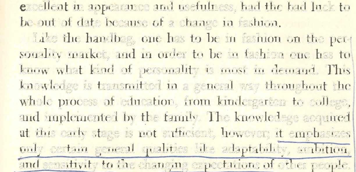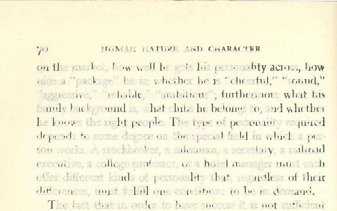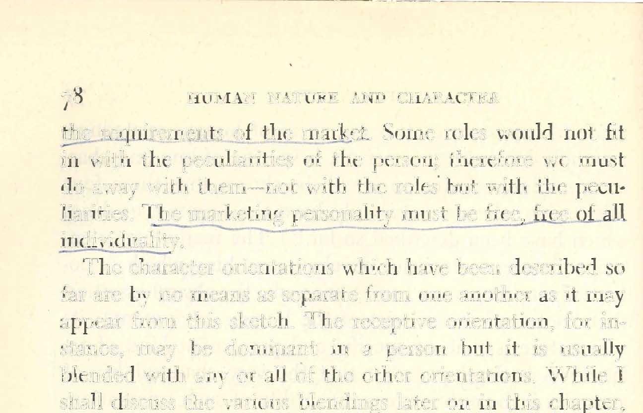 common: each form relatedness dominant in is and him. will be these orientations necessarily have negative described farP) marketing however, develop something which is tentially the person (unless make absurd assertion that "nothing" the human equipment); very that and permanent kind J latedness developed, the very changeability attitudes the quality orientation. In this orientation, those qualities developed which best sold. particular predominant, but emptiness which quickly the desired quality. quality, be l the sense of the word; the pretense of a quality, to be readily one desirable. Thus, instance, respectability is sometimes desirable. The salesmen in certain branches of business ought impress public qualities of soberness, and respectability genuine businessman Now man instills he looks as these qualities; on the market ability what kind behind role nobody's concern. He himself is not interested in his honesty, but for the market. orientation emI'tiness the could be to persistent might conflict