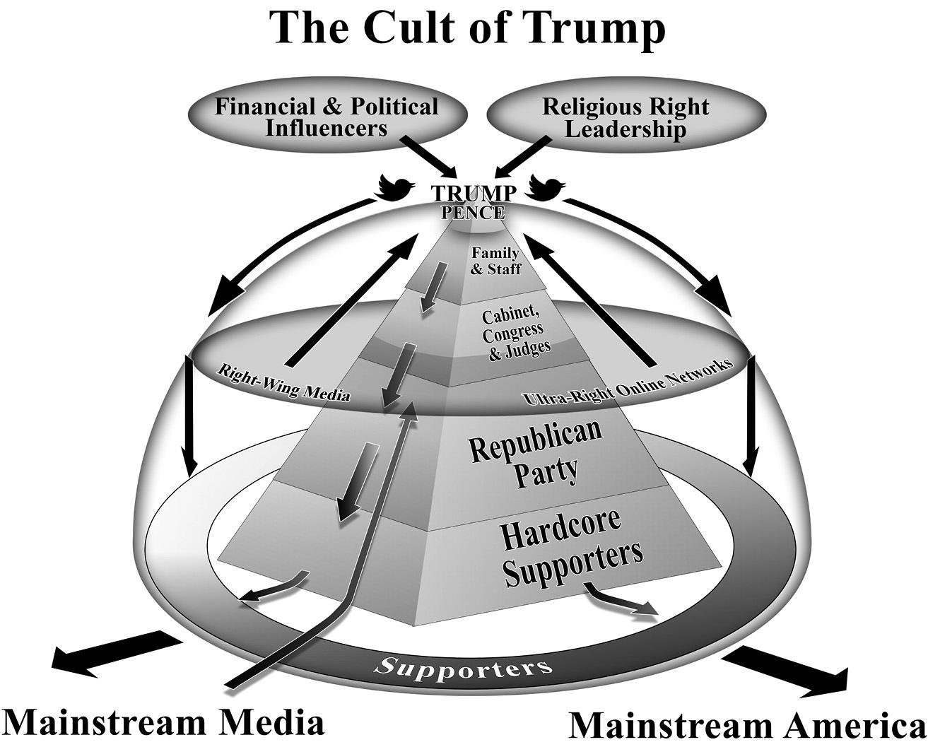 Cult membersmay bring other people through the door but what ensnaresthem isa complex array of influencetechniques, appliedincrementally tocontrolalmostevery aspectofaperson theway they act (behavior),whattheyread,watch,orlistento(information),thewaytheythink(thoughts),andhowtheyfeel (emotions).Trumphasgottenmillionsofpeopletobelieve,support,andevenadorehimbyusingtechniques ineachoftheseareas: