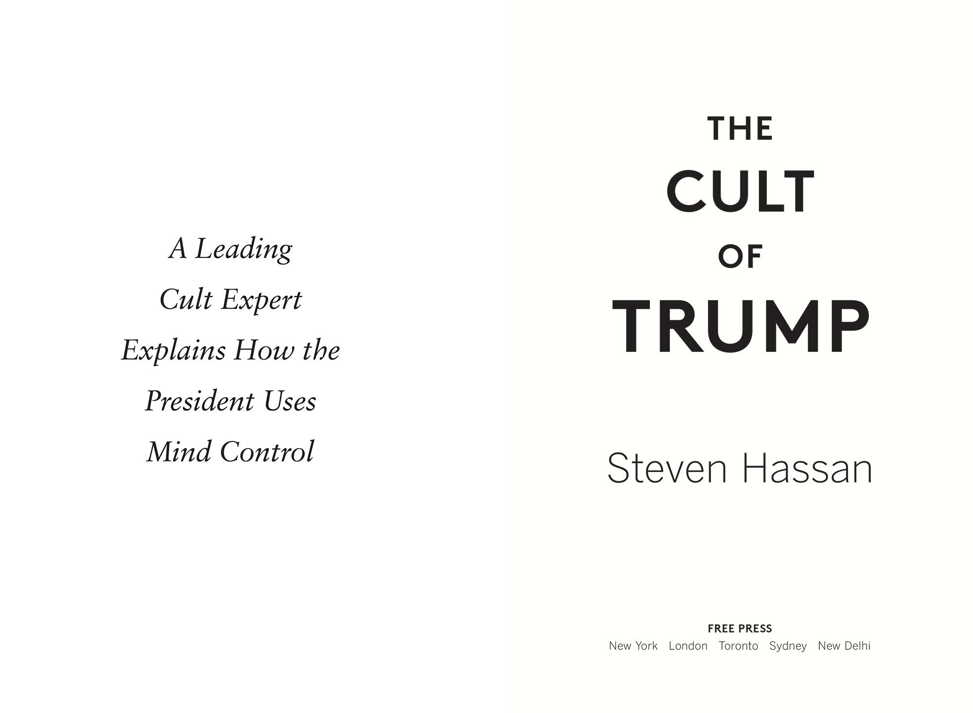 Anenormousamountofresearchwasundertakentocompletethisbook.Iamgratefultothecreatorsof the many books, articles, interviews, podcasts, andvideosthathelpedme better comprehendthe Cultof Trump.Thankyouforsharing,directly,yourknowledge,expertise,andtimewithme:DavidCayJohnston (whohasbeenwritingaboutTrumpforfiftyyears),JamesMoore,Dr.AndréGagné,FrankCocozzelli,Yves Messer,DennisKing,ChipBerlet,JeffreySharlet,Dr.JamesScaminaciIII,Dr.WarrenThrockmorton,Dr. JohnWeaver,Dr.ChristopherStroop,Dr.JohnDehlin,DavidWeissman,ArnoMichaelis,ScottAdams, Allen Tate Wood, Jefferson Hawkins, Michele (Chele) Roland, Taryn Southern, Spanky Taylor, Tory Christman,HoytRichards,RabbiTerryRossBard,StephaneAcel-Green,CellWhitman,andLarryZilliox. SpecialthankyoutoKarinSpikeRobinsonforresearch,copyediting,andgraphicsassistance.Thankyouto Rebecca Johnston for your support. Thanks to Kimmy O’Donnell and Jane at the Freedom of Mind ResourceCenter.