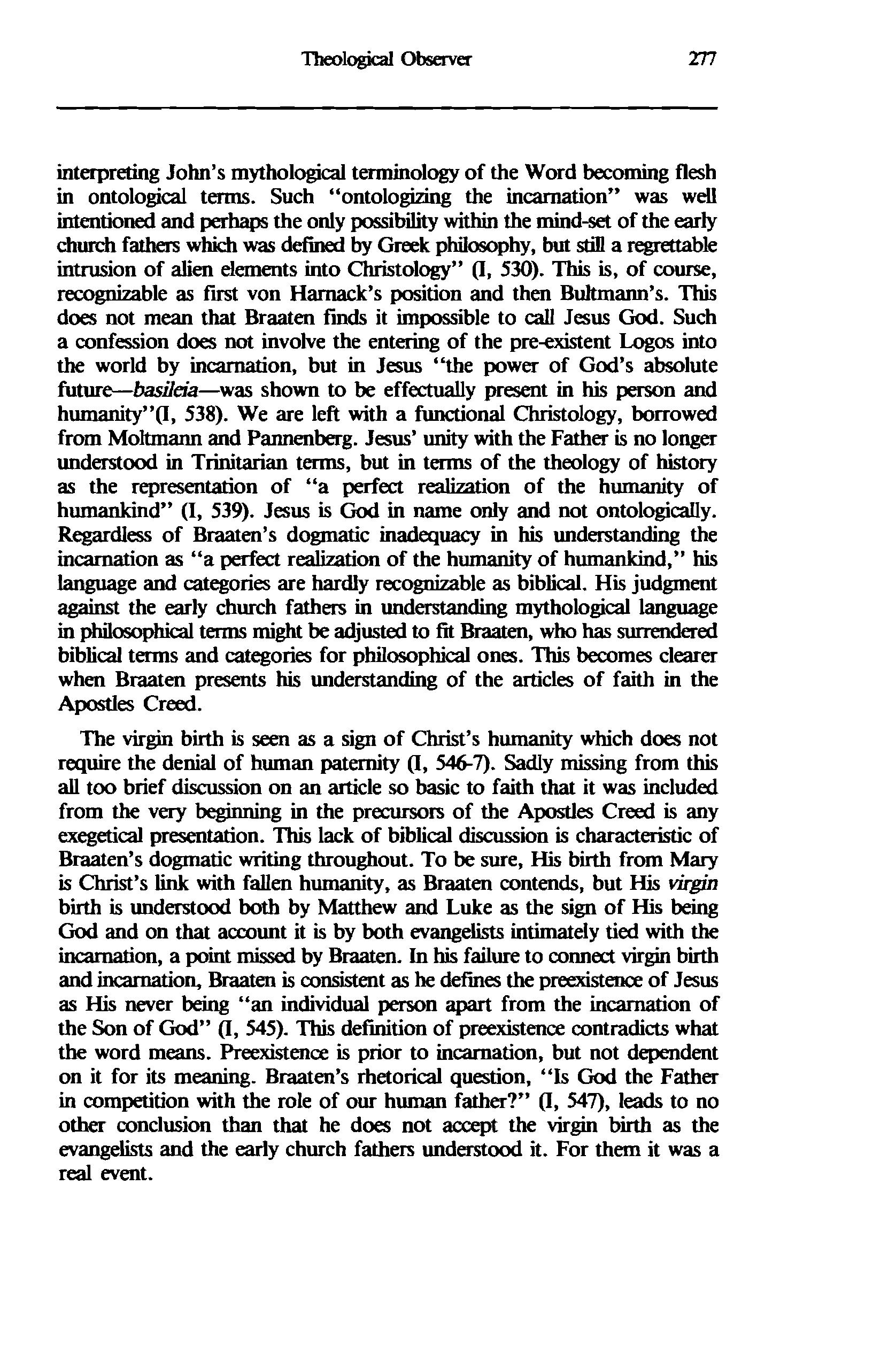 The virgin birth is seen as a sign of Christ's humanity which does not require the denial of human paternity (I, W7).Sadly missing from this all too brief discussion on an article so basic to faith that it was included from the very beginning in the precursors of the Apostles Creed is any exegetical presentation. This lack of biblical discussion is characteristic of Braaten's dogmatic writing throughout. To be sure, His birth from Mary is Christ's link with fallen humanity, as Braaten contends, but His virgin birth is understood both by Matthew and Luke as the sign of His being God and on that account it is by both evangelists intimately tied with the mcamation, a point missed by Braaten. In his failure to connect virgin birth and inamation, Braaten is consistent as he defines the preexistence of Jesus as His never being "an individual person apart from the incarnation of the Son of God" (I, 545). This definition of preexistence contradicts what the word means. F'mz&ence is prior to incarnation, but not dependent on it for its meaning. Braaten's rhetorical question, ''Is God the Father in competition with the role of our human father?" (I, 547), leads to no 0th conclusion than that he does not accept the virgin birth as the evangelists and the early church fathers understood it. For them it was a real event.