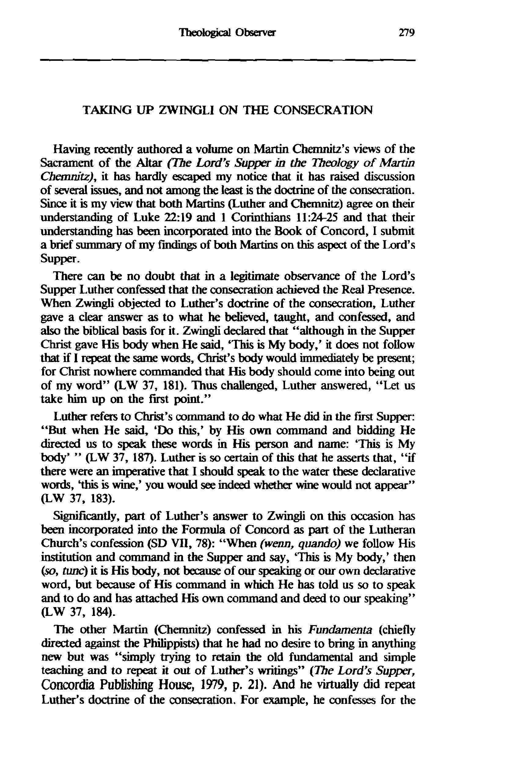 Having recently authored a voIume on Martin Chemnitz's views of the Sacrament of the Altar @Be Lord's Supper in the lTteoIogy of Martin Chm-tz), it has hardly escaped my notice that it has raised discussion of several issues, and not among the least is the doctrine of the consemation. Since it is my view that both Martins (Luther and Chemnitz) agree on their understanding of Luke 2219 and 1 Corinthians 11:24-25 and that their understanding has been incorporated into the Book of Concord, I submit a brief summary of my fm of both Martins on this aspect of the Lord's supper.