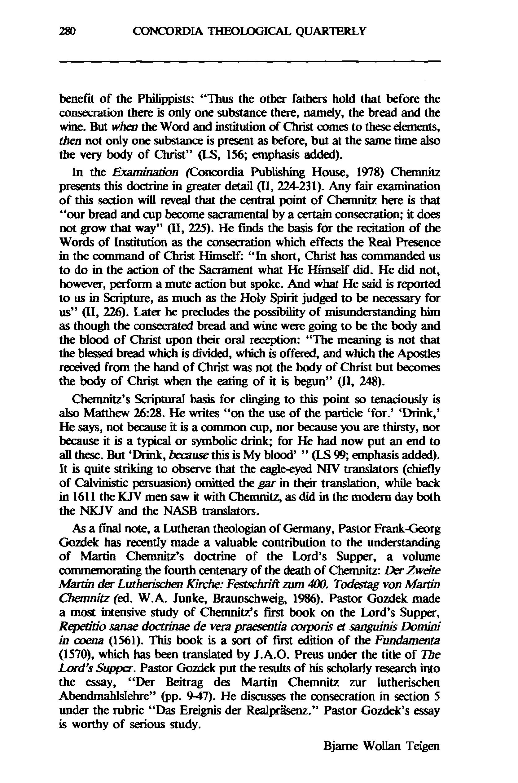As a final note, a Lutheran theologian of Germany, Pastor Frankhrg Gozdek has recently made a valuable contribution to the understanding of Martin Chemnitz's doctrine of the Lord's Supper, a volume co-dg the fourth centenary of the death of Chemnitz: lk Zweite Mkth der Luthenichen Kirche: Fistxiuift zum 40,Todstag von Martin Cikzmzb (ed. W.A. Junke, Braunschweig, 1986). Pastor Gozdek made a most intensive study of Chemnitz's first book on the Lord's Supper, Repli'h'o same ddoch-iraaede Vera pmesentia wrporis et Domini in ~xlena(1561). This book is a sort of first edition of the Fmd.amenta (1570), which has been tmdated by J.A.O. Preus under the title of The Lord's Supper. Pastor Gozdek put the results of his scholarly research into the essay, "Der Beitrag des Martin Chemnitz zur lutherischen AbendmahlsIehre" (pp. 947). He discusses the conseaation in section 5 under the nibric "Das Ereignis der Realphmz." Pastor Gozdek's essay is worthy of serious study.