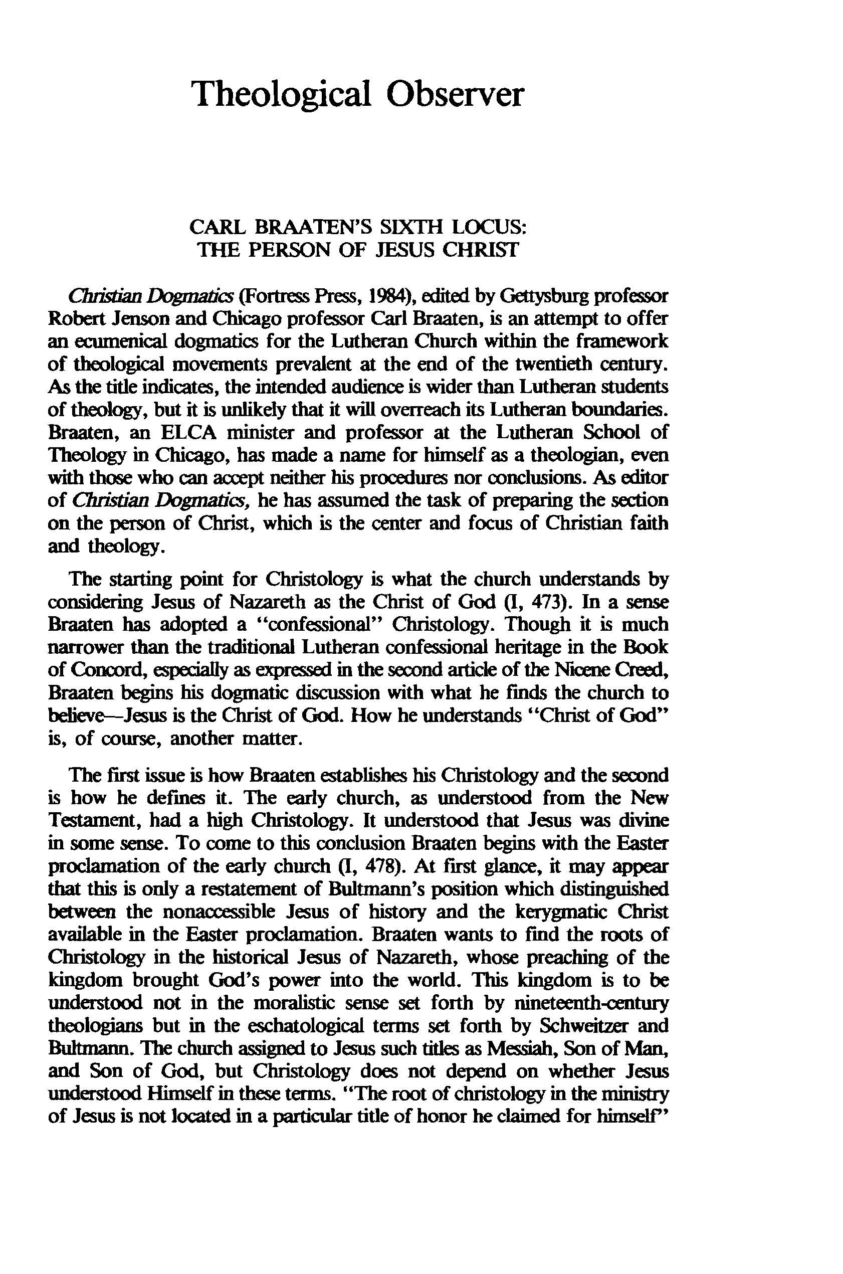 In pursuing dogmatics, Braaten wants to take into consideration the nineteenth and twentieth century exegetical understanding of Jesus without having to choose between the several options and at the same time without surrendering the classical Christology, or at least its terms, even if he has to redefine them. This was the mark of neo-orthodoxy. Braaten's confdence in such diverse and contradictory exegetical methods and conclusions, developed by an almost premedkited evolutionistic development and blended into monolithic conclusions, is either brilliant or just naive. To add the classical +on to his Christology, Braaten reviews the dogmatic concerns which lead up to the early church councils, the Lutheran Confessions, and the discussions raised by the Erlangen theologians in the nineteenth century. In his breadth of knowledge and historical procedure, Braaten is not unlike Francis Pieper, whose title, Chistian Dogmafj(s, Braaten and Jenson borrowed without giving appropriate credit. Braaten wants to work within Lutheran boundaries. Whether he succeeds is another matter.