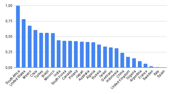 South Africa ranks highest by far in the Keynes1 index, followed by Brazil, Chile, and Mexico. This is a direct consequence of the weight that income and wealth inequality exceptionally high in these countries have in Keynes’ failure index.