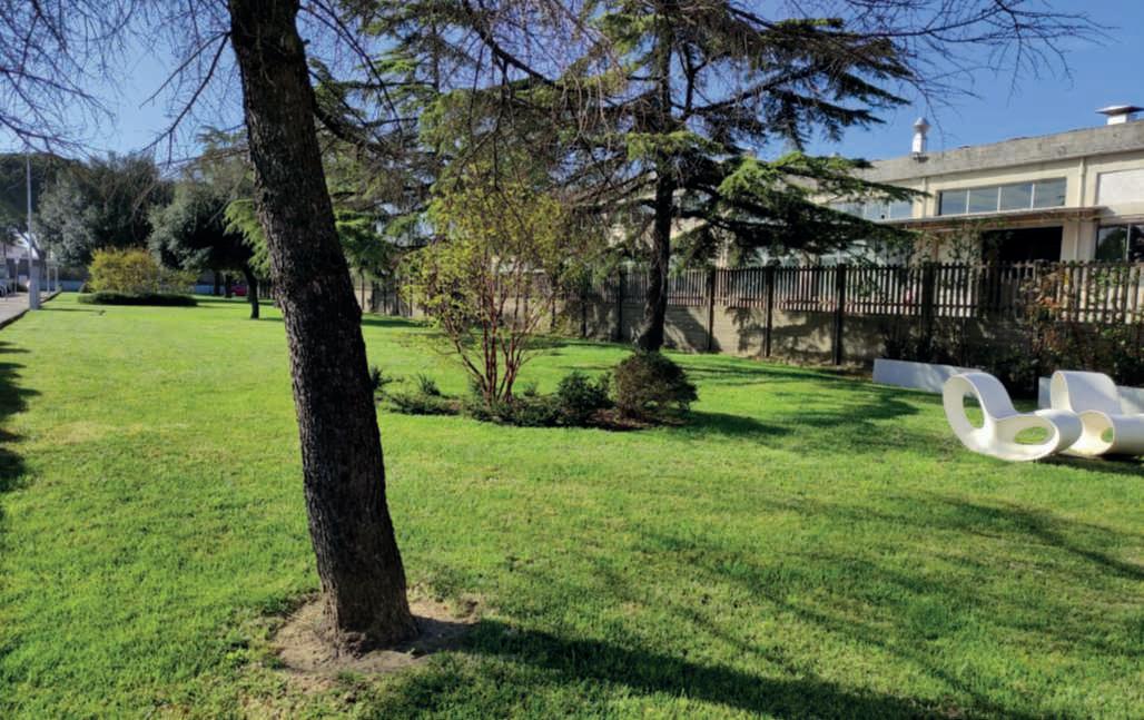 Nella pagina di sinistra,i nuovi drygarden all’ingresso dell’azienda.Due grandi aiuolepiantumate seguendo iprincipideigiardiniabasso consumoidrico,graziealla creazionediunecosistema dove possono esseresufficienti solounpaiodiirrigazioni all’annoneimesipiùcaldi. Inquestapagina,lapiazza antistantelaconceria, interamenteristrutturatada MasoniS.p.A.nel2016,che daallorasioccupaanchedella suamanutenzione.