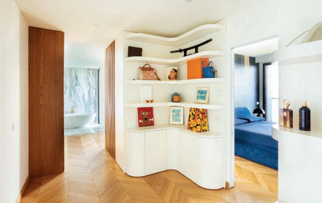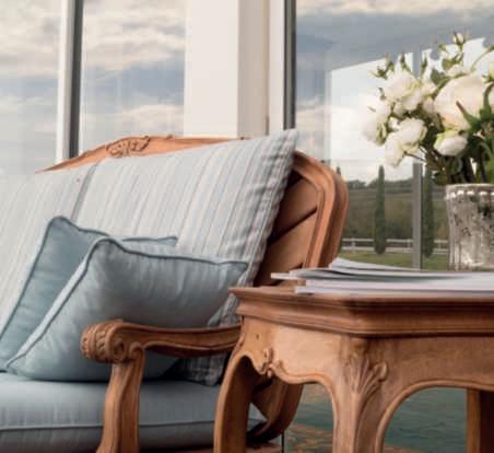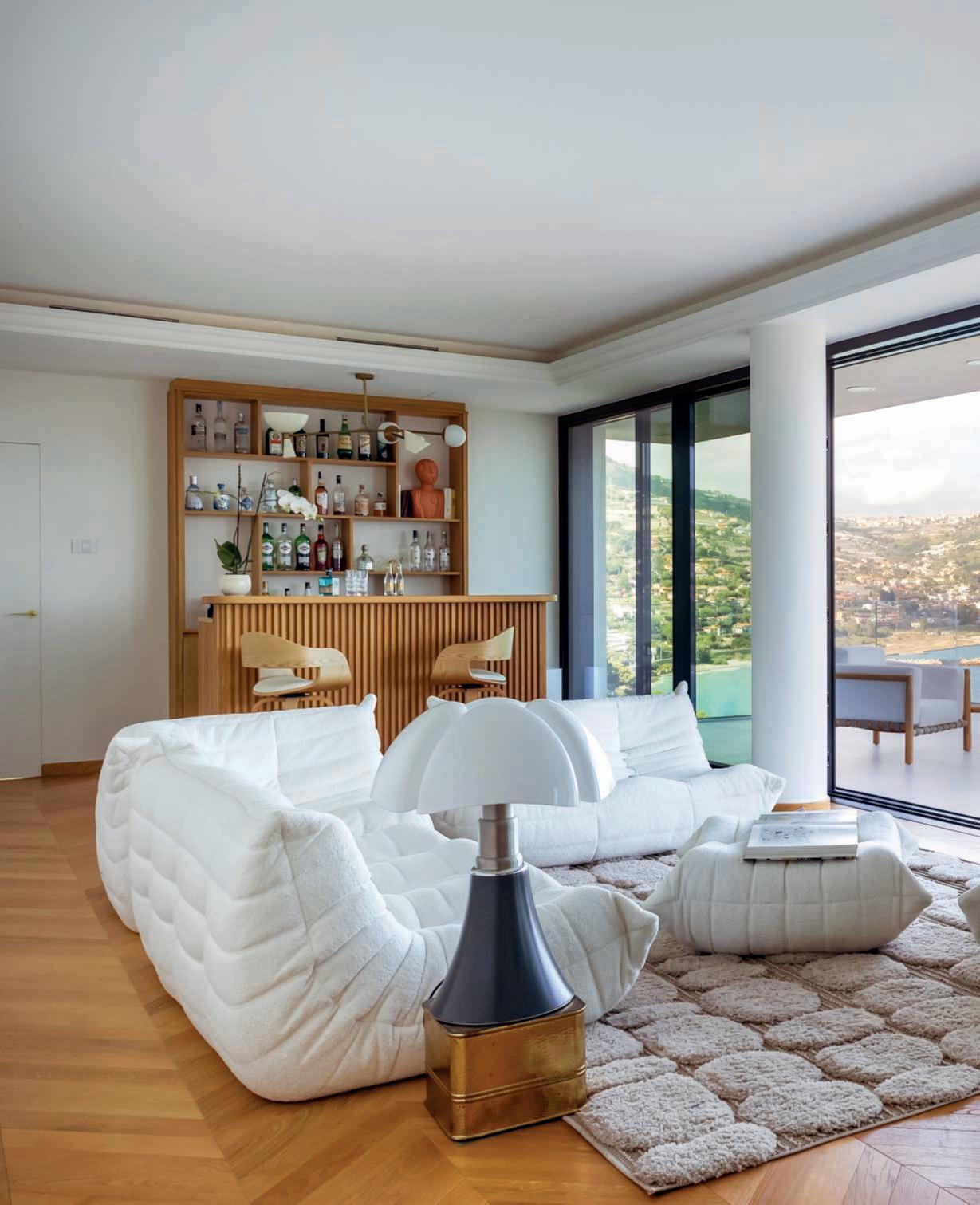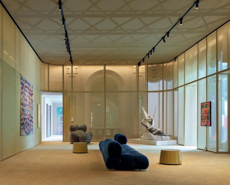 Onthesepages,some elementsfromthe IntheMood forLove collection,designed by MauroLipparini for Conte Ontheleftpage,alivingspace with HappyTogethersofa, PerfectDaysmultifunctional unit,and SunsetBoulevard coffeetable.Onthispage, above, Fairytale display case, andhereontheleft, Rosebud armchair