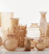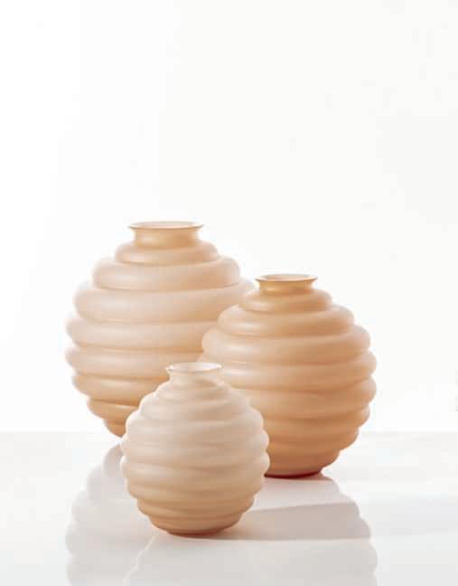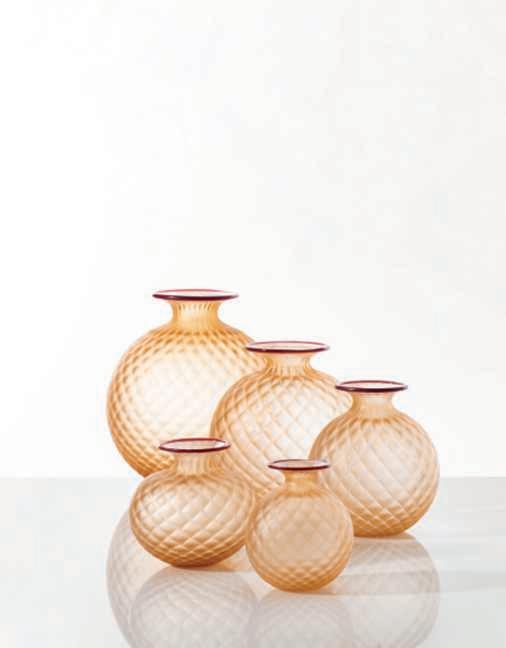 In queste pagine,alcune propostedella nuovacapsule collectionPesca che veste di uncoloremorbidoeavvolgente alcuniiconicivasidi Venini.Qui sopra, Fazzoletto, design Fulvio BianconiePaoloVenini.Nella pagina di destra,insensoorario: Deco di Napoleone Martinuzzi; Monofiori Balloton; Ritagli di FulvioBianconi; Acco,Idalione Sidone di AlessandroMendini