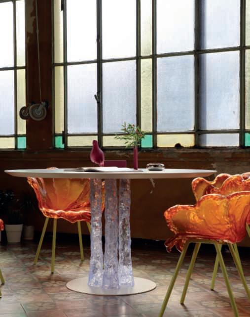 thatcharacterisesthecompany’scatalogueispolystyrene,whichcanbe paintedinthecoloursoftheSturmpaletteorcustom-madeonrequest. Thankstothenon-homogenoustransparencyofthismaterial,eachobjecttakesonanappearancethatmakesitunique.Thenew2024models (onthesepages),arecharacterisedbythemanualprocessingofpolystyrene,similartothemanufactureofblownglassobjectsinMurano.This processinginfactgivesthepolystyreneunpredictablecracksandripples,whichdevelopdifferentlyeachtime.Inadditiontothis,thecolourandsizecanalsovary fromonepiecetoanother,makingeachcreation uniqueandinimitable,inwhichthemodernity ofdesignissynthesisedwiththepoetryandunpredictability of the art object.