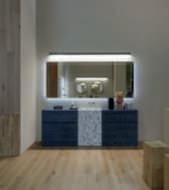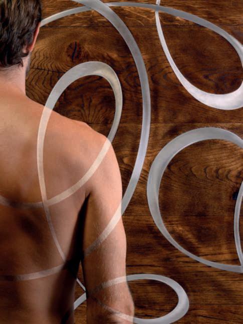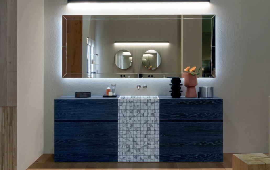 Rigour and customisation. Progetto Bagno is a proposal dedicated to the developmentofintegratedfurnishingandcladdingsolutionsforthebathroom, characterised by the combination of wood and refined materials. ProgettoBagnoisanintegralpartofajourneyinwhichItlas,renownedfor itsproductionofparquetflooringandwoodcladding,presentsaconceptof homebuiltupontherawmaterialsthathaveunderpinneditssuccess.Inthe 5MillimetresBathroomProjectprogramme,thewoodessences,originally intendedtocharacterisefloorsandwalls,becomea centralanddistinctiveelementofsolutionsdesigned forthebathroomarea.Theunionofdesignand naturepromotesconceptsrelatedtoeleganceand sophistication,identifyingspaceswithcleanand essentiallinesthatenhancethequalityofmaterial combinations.Amongthenewproposals,presented attheSalonedelMobileinMilan,istheconfigurationonthesepages,withacabinetmadeinD003 Darkoakessenceandafloor-standingmonobloc marbleSquaresink.Thespaceiscompletedbythe DecoramirrorwithLEDbacklightingandtheMinimal wall-mounted faucet in satin-finish steel. ■