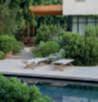 On this page,arefined swimming pool with Malta Bluepixelmosaic from the Mediterranea collection. At the edge ofthepool,the furnishing elements arealso by SICIS: an outdoor armchair with armrests and sunbeds fromthe Lipari collection;a cube-shaped table inVetrite withbacklightingfromthe Panarea collection;alow FilicudiSideTable;a Drop BatteryLamp