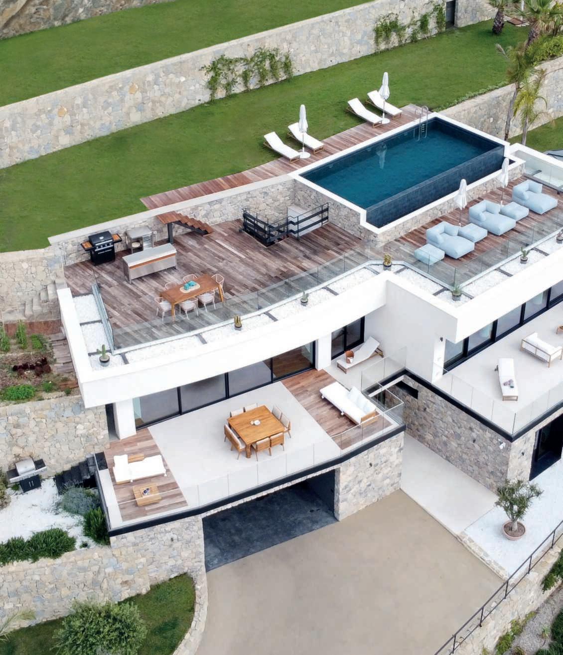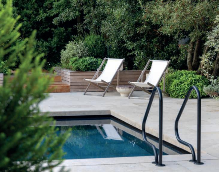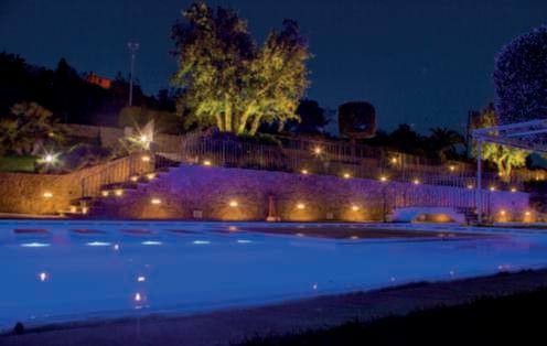 In questa pagina,unaraffinata piscinacon Mosaicopixel MaltaBlue dellacollezione Mediterranea.Abordovasca, ancheglielementid’arredo sono firmati SICIS:poltrona outdoorconbracciolie lettinidellacollezione Lipari tavolinodiformacubicain Vetriteconretroilluminazione dellacollezione Panarea; tavolobasso FilicudiSide Table;lampadadatavolo DropBatteryLamp