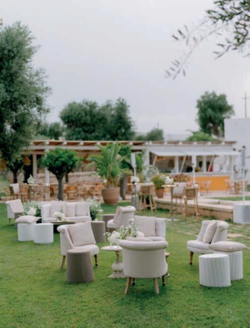 In queste pagine,alcuniallestimenti per matrimoni firmati SilviaSlitti.Nellapaginadi sinistra,inalto,ilbiancoeil verdesonoprotagonistialla MasseriaCalderisidiFasano (Brindisi).Inbasso,loungesu pratoconpoltrone e tavolini abordopiscina,semprenella MasseriaCalderisi.Foto di Facibeni fotografia – Luxury Wedding Photography Inquestapagina,inaltoa sinistra,salottiniconcomposi-