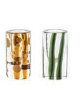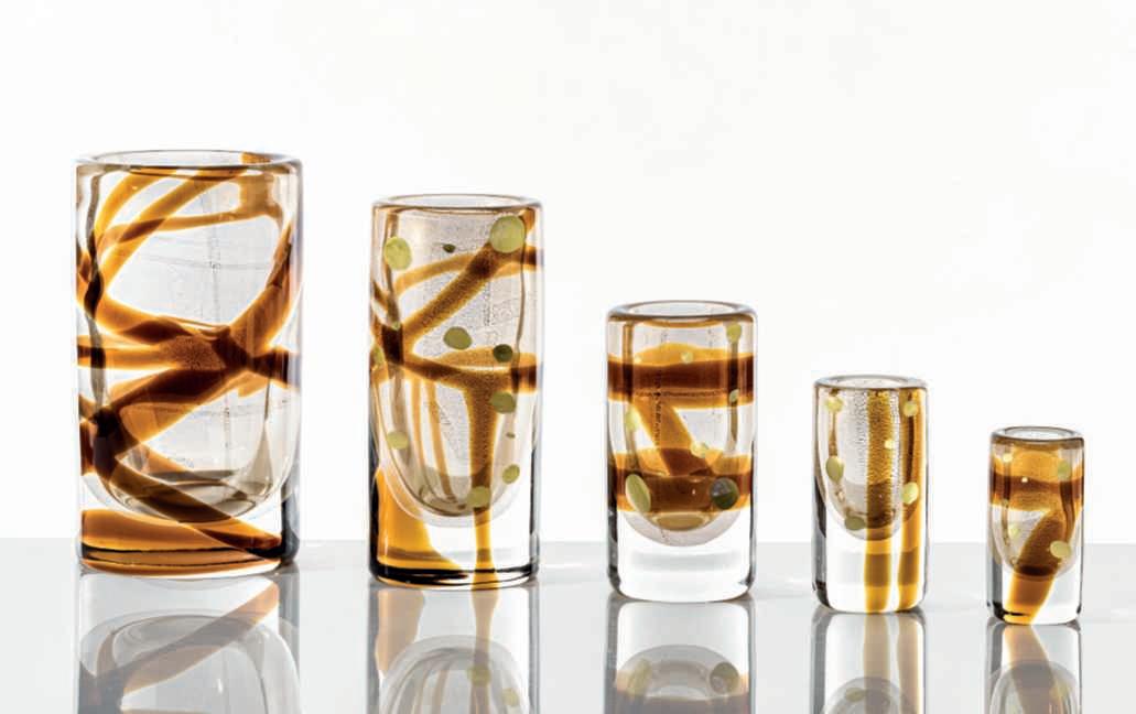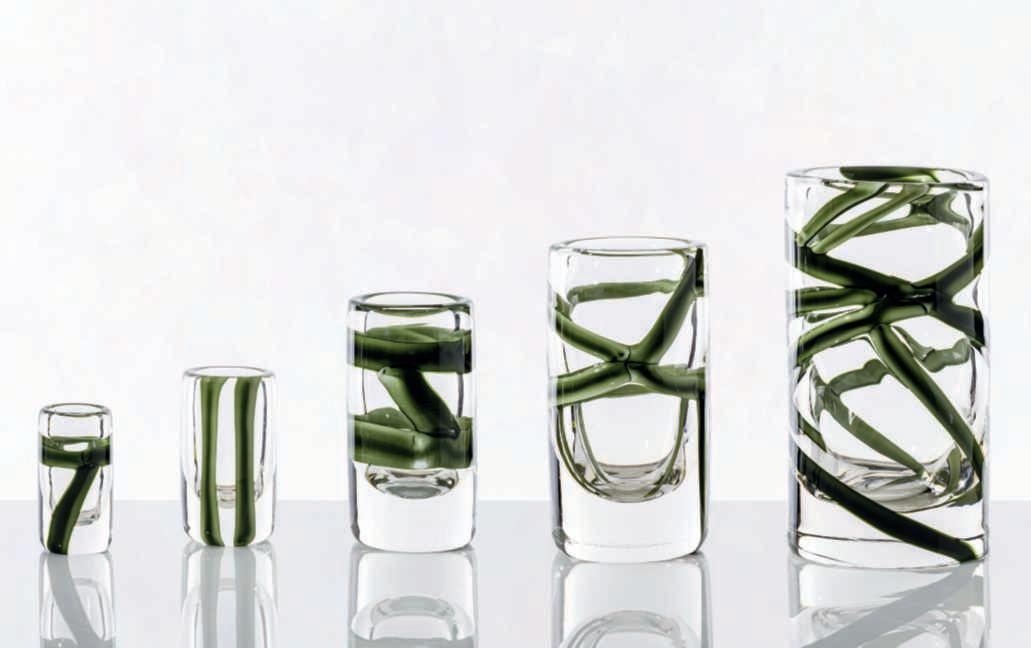 Lacollezione Cilindro è caratterizzata da un volume geometrico avvoltodaundecororealizzatoconlatecnicadellefasce,nastricoloratiamalgamatidalmaestrovetraioalcorpoprincipaledell’oggetto percreareunelegantecontrastoconilvetrocolorcristallo.Questi decori,dalleformemorbideeirregolarichecatturanol’attenzione,vengonopropostiinduenuovevarianticromatiche.Laprima presentafascetrasparentinelcoloreTè,condecorismaltatiinoro, mentrelasecondafasceVerdemelaopalino.Lacollezionedibicchieri BlackBelt,pensataperdiventareprotagonistanelle misean place piùraffinate,presentadiversidecorirealizzaticonfascenere applicateacaldoconmaestriaartigianalesulvetrosoffiato.Ilrisultatoèunoggettocheconiugaunaispirazionecromaticaminimal con forme vibranti e di forte espressività. l venini.com