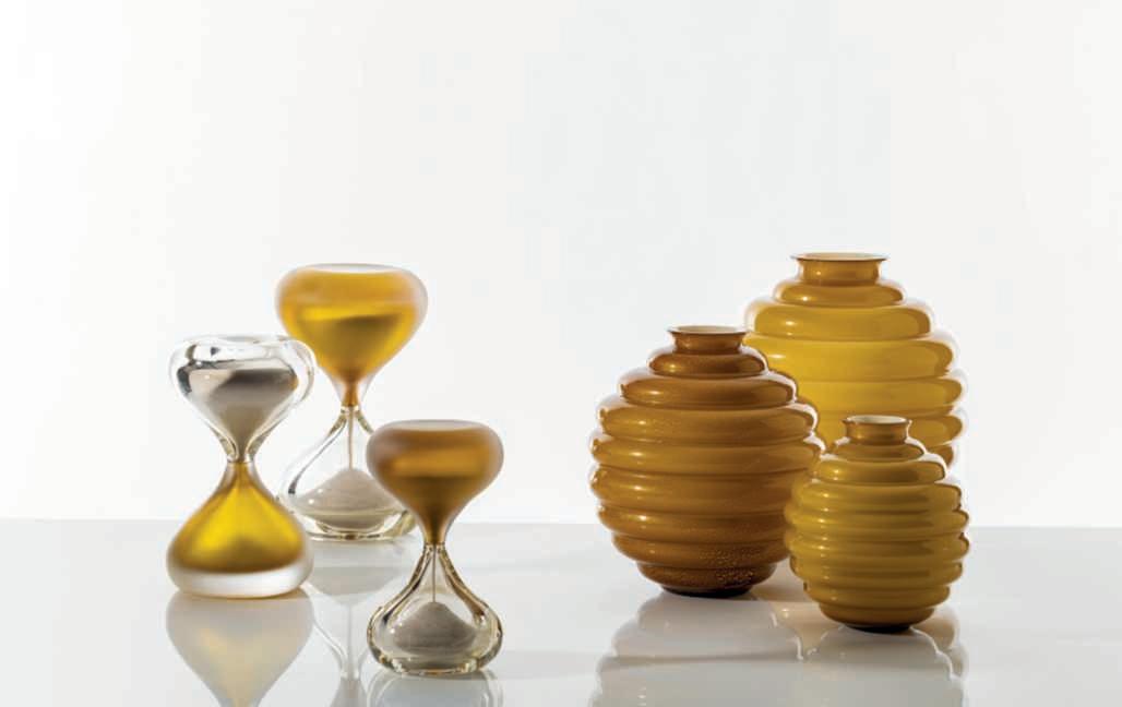 Ontheleftpage,againfrom the PescaCapsuleCollection: Opalino (top); BattutoaNido d’Ape,design CarloScarpa (bottom). Onthispage,top, Venini for Gruppo Damiani Collection; bottom, ClessidreSommerse, designby FulvioBianconi and PaoloVenini