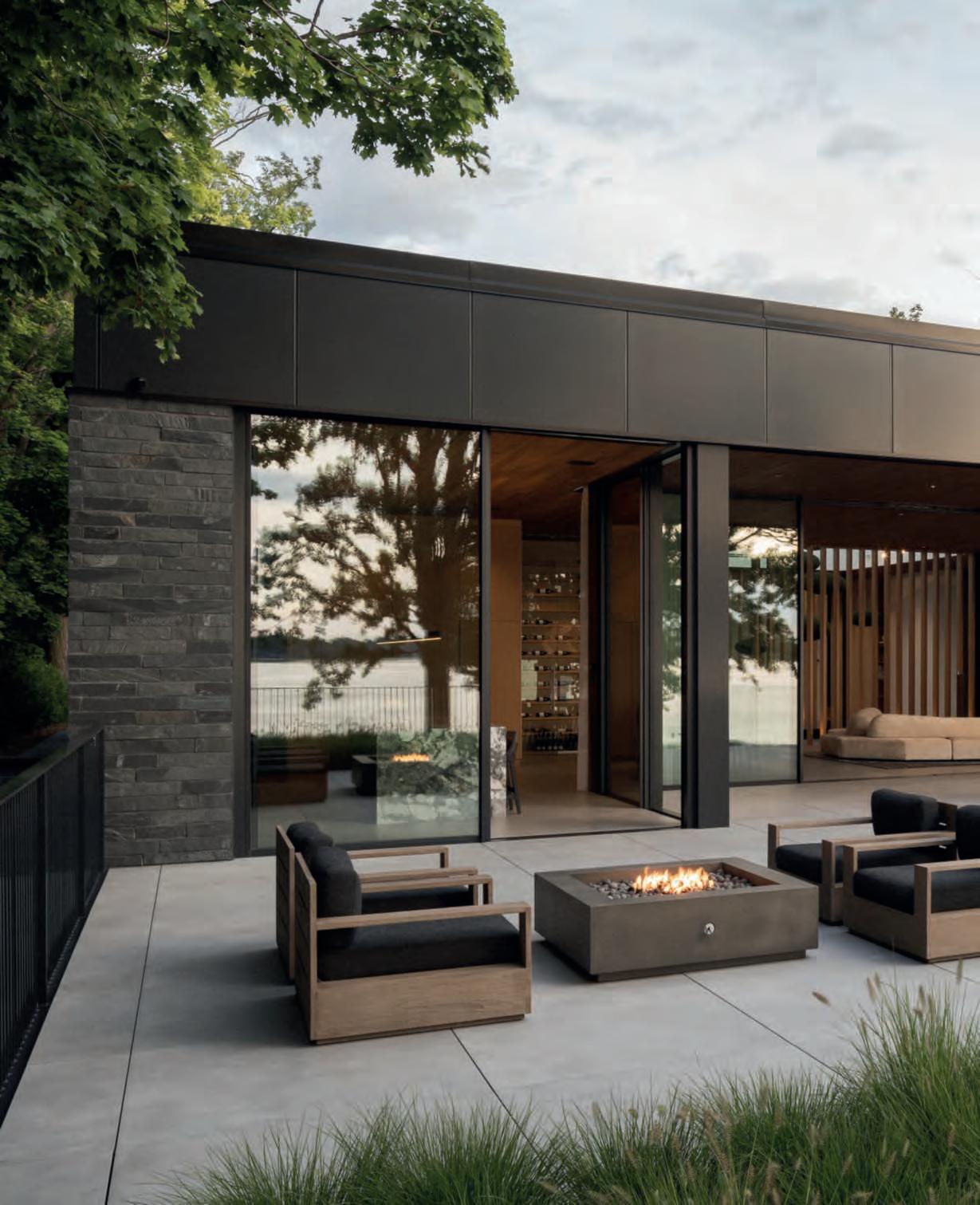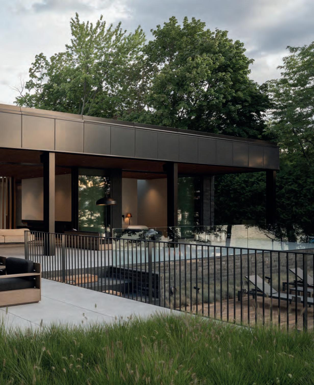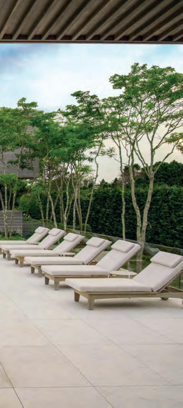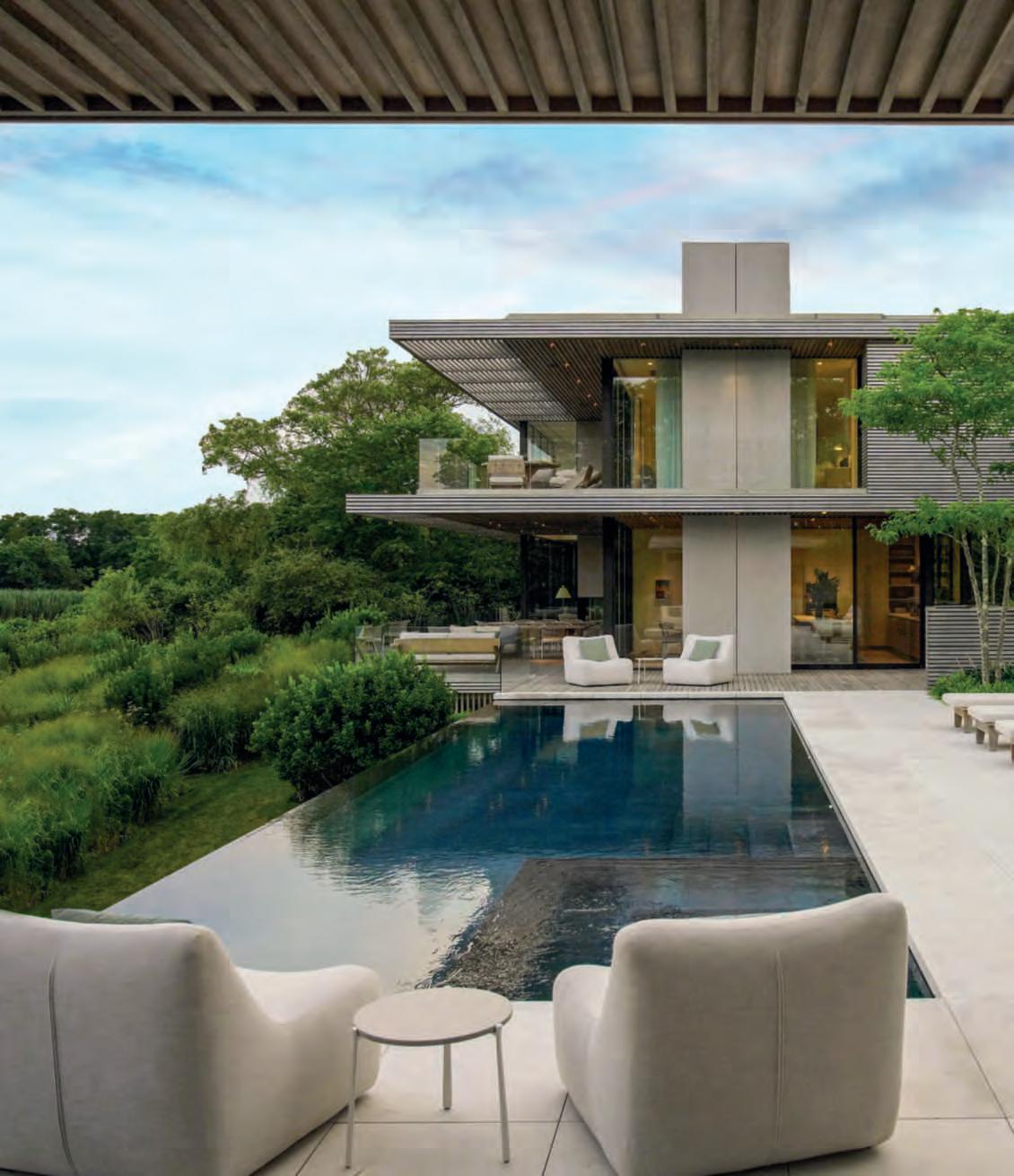 Inquestepagine,unavista della villa edella terrazza la piscina a sfioro house;sinotanole triacanthos var. inermis ceppaia piantate anche nelle fiorieredallascala d’ingresso. Nelle pagineprecedenti, una vistaaerea del giardino posteriore affacciatosulle rive della MecoxBay meadow chesfumanella vegetazionespontaneaesi fonde con essa.