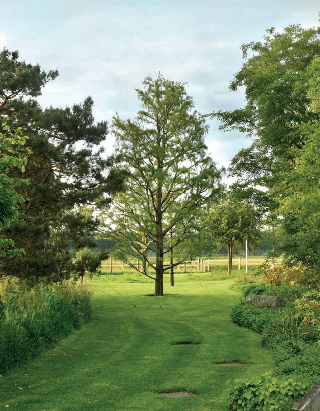 Nella foto di questa pagina, unavistadell’arearetrostante allapoolhouse.Èdominata daborduredallelineesinuose ailatidelpratodominatoda un Taxodiumdistichum var. Distichum.Inprimopiano unamacchiadi Epimedium x versicolor‘Sulphureum’ e di Ceratostigmaplumbaginoides.Nellefotodellapaginadi destra,inalto,unavistadelle villaedellescuderiedalla poolhouse,conle betulle a interromperelalinearitàdelle