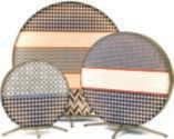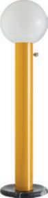 Lampadedaterraoutdoor della collezione Babu. Nella finituraTextile, la struttura tondainacciaioracchiude tessuti per esterni con stampa digitalegeometricainrilievo e passamaneria in velluto.
