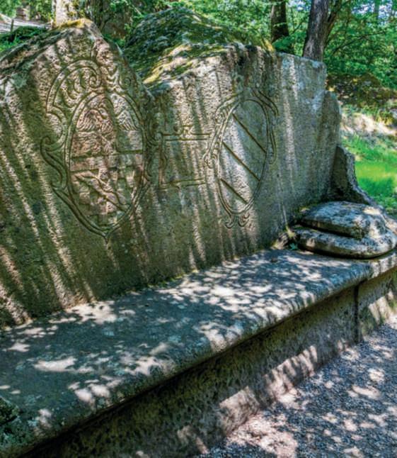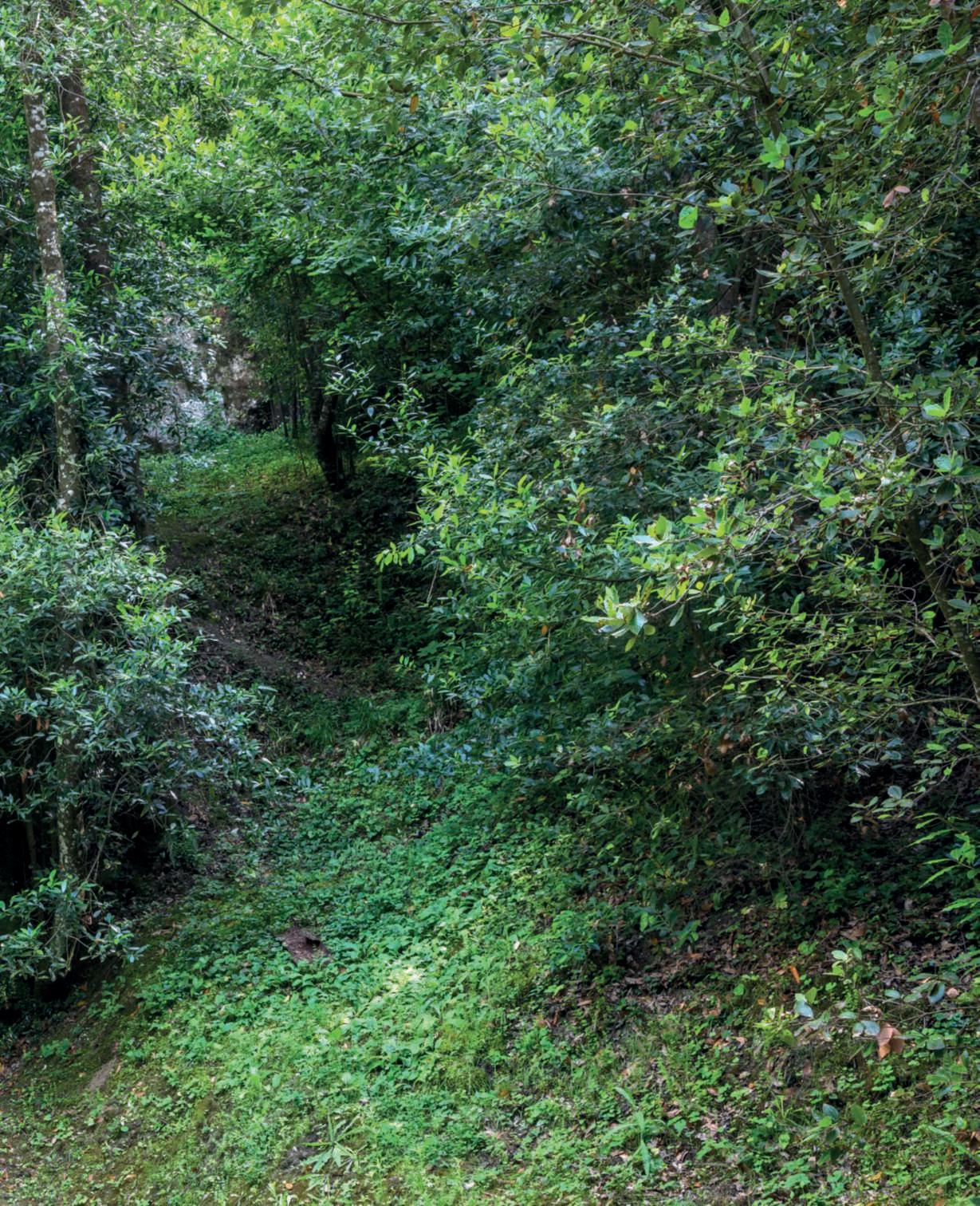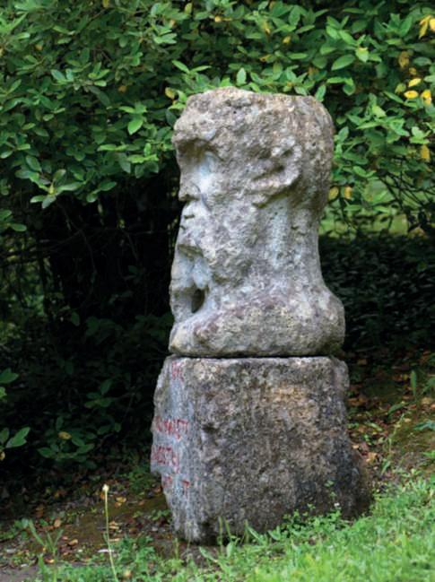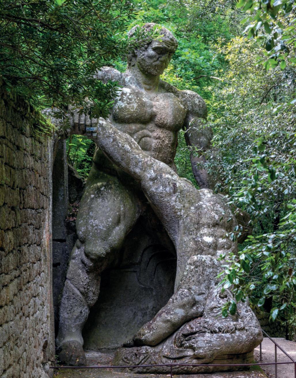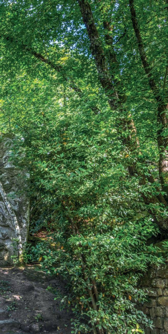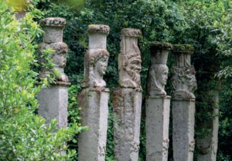 unanicchiascavatainunmuro parzialmentecrollato.Nella fotodellapaginadidestra,la gigantomachia,oppure Ercole eCaco o ancora ErcoleeLica, figure della mitologia greca. Secondo l’ultima interpretazione,ErcolesarebbeVicino Orsini, come dimostratodallo scudoornatodirose (uno dei simbolidelsuocasato),che con il SacroBoscoha trasformato gli uomini in pietra. FotodiDarioFusaro ArchivioGrandiGiardiniItaliani