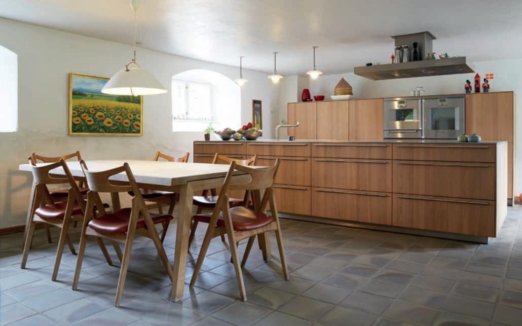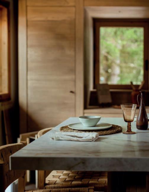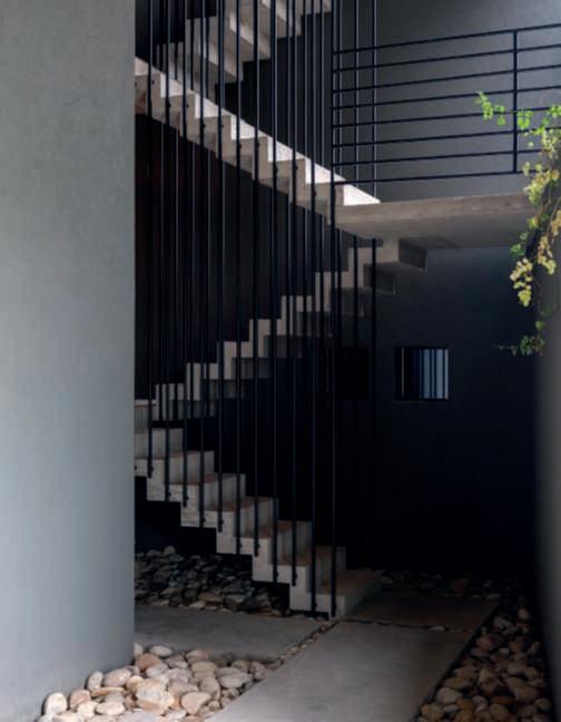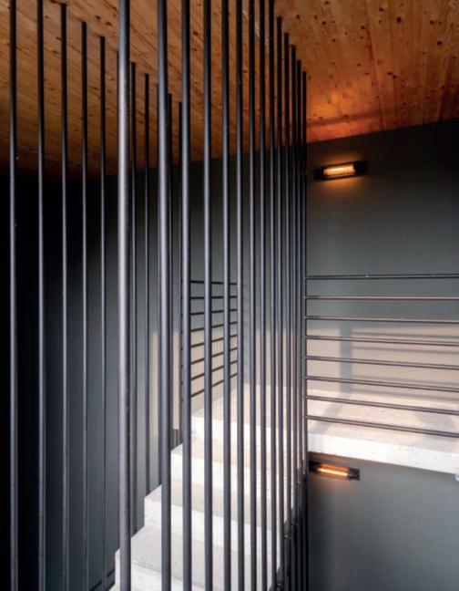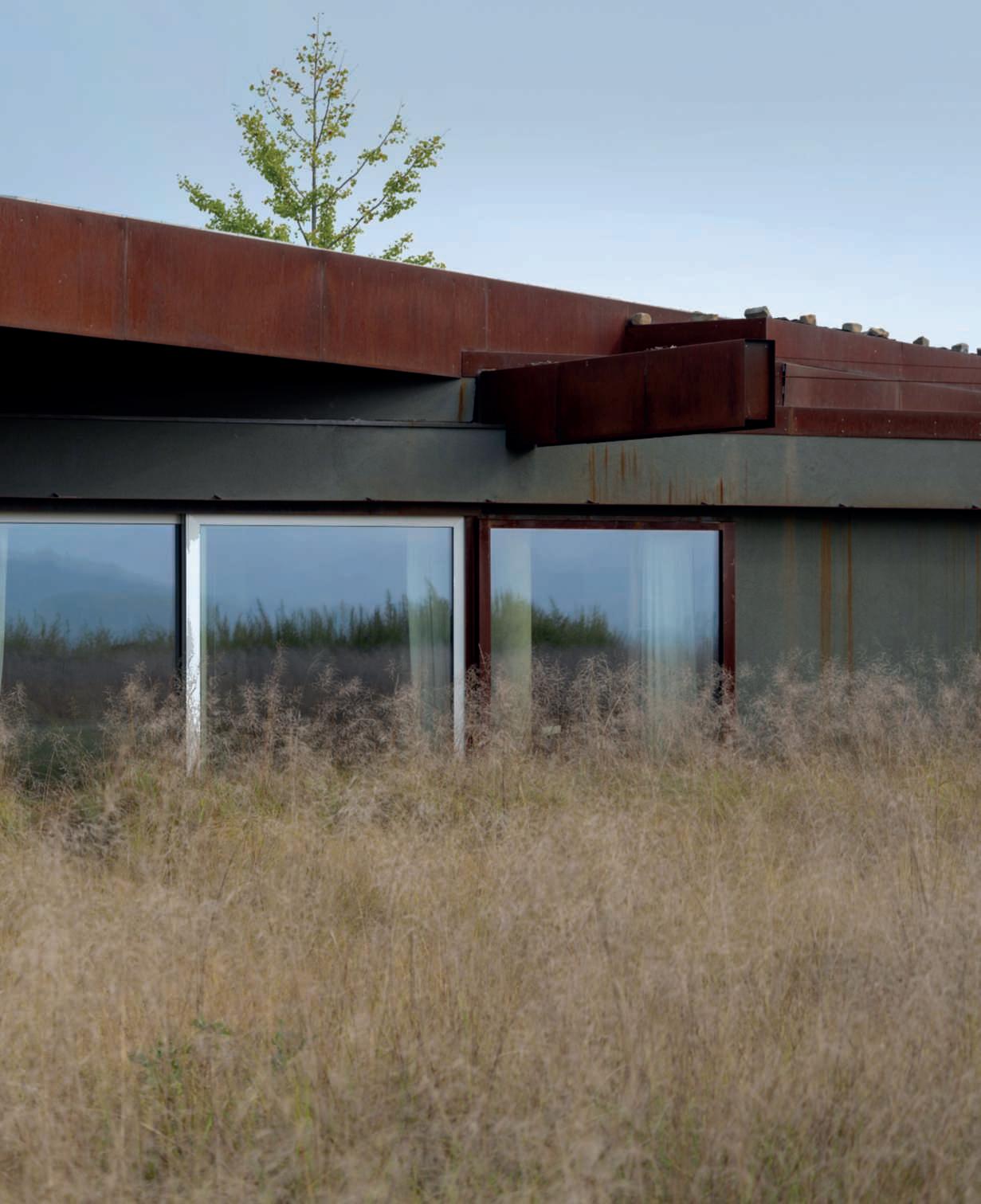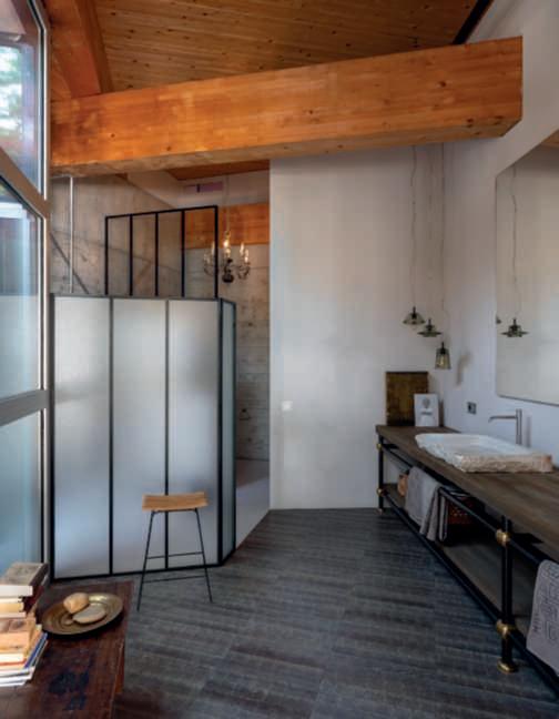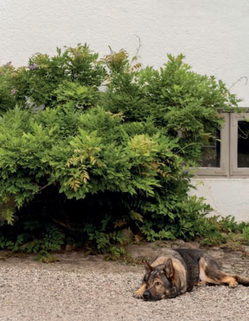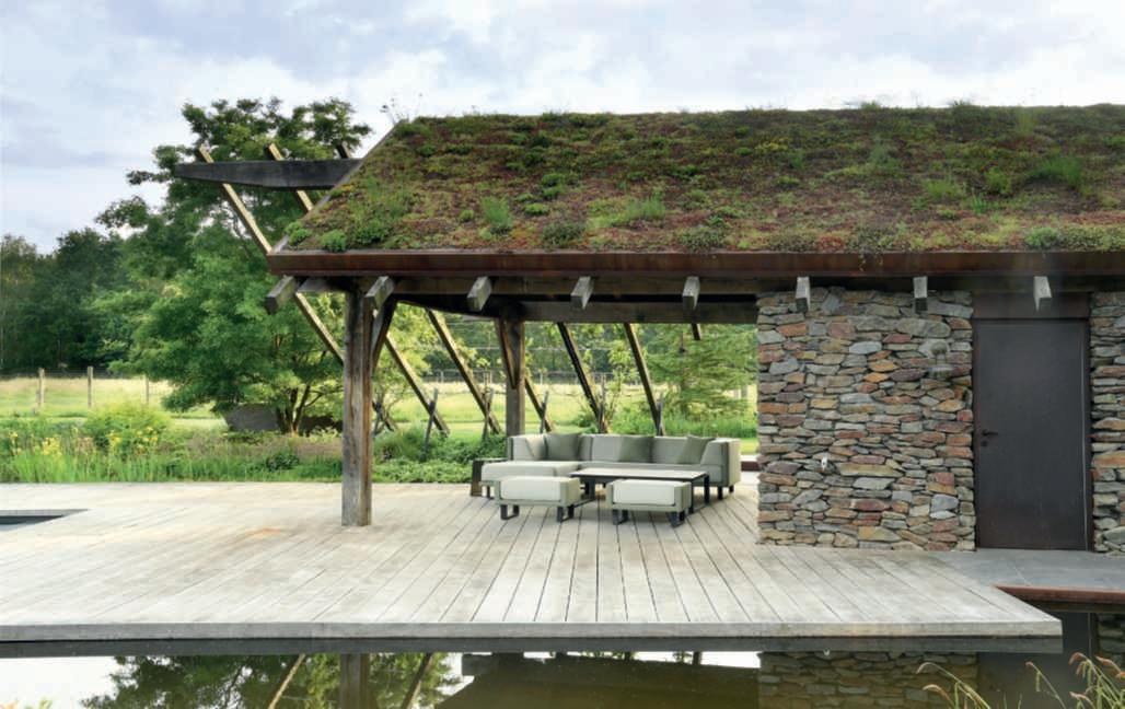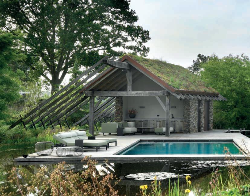 Nelle foto della pagina di sinistra,inalto,undettaglio della poolhouse in pietra locale e travidirecupero, con il tettoa verdepensile estensivo e la zona attrezzata con una cucina e divani per i momenti di relaxnellanatura, si notano le travi sul retrodel tetto chegiungonofinoaterra, unelemento nonsoloestetico maanchefunzionale,poiché servonocomesostegnoper irampicanti;inbasso,una vistadell’ingressodellavilla, dominatodauna Zelkova carpinifolia ‘Verschaffeltii’ e da bordurepunteggiateda sferedi Ilexcrenata ‘Convexa’ di dimensione differente insiemea Epimedium x versicolor ‘Sulphureum’, Hosta ‘Halcyon’ e Aquilegia vulgaris. Nelle foto di questa pagina,inalto,unavistadelle scuderieconicavalli;inbasso, unavistadelgiardino sul retro dellapoolhouseconinprimo piani le travi che sostengono Vitisvinifera ‘Solaris’, particolarmenteadattaaclimi piùfreddi.
