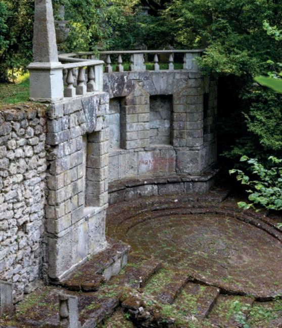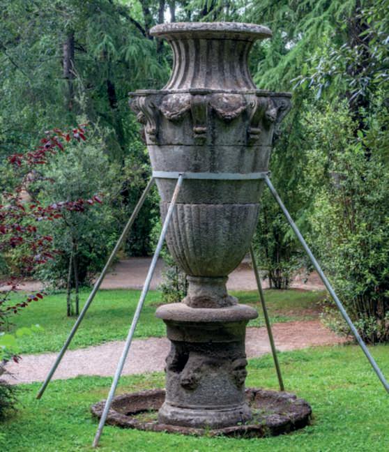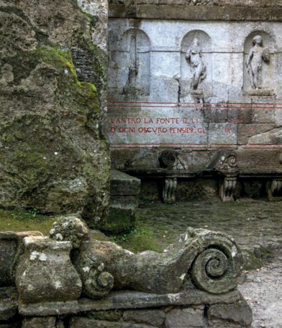 Nellefotodellepagine precedenti,asinistra, una delle due sfingi all’ingresso, con alla baseun’epigrafecherivelache l’obiettivodiOrsinifosse impressionare i visitatoricon unargutosensodimeraviglia; adestra in alto,ermadi Pan Giano,nelvialed’ingressoa sinistra delle sfingi; in basso, particolare di un vaso nel piazzaledellevasi.Nellefotodi questapagina,inalto,una sedutanelparcoconstemmi araldici, inbassoil Ninfeo,in
