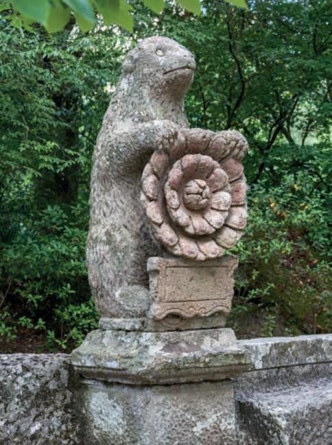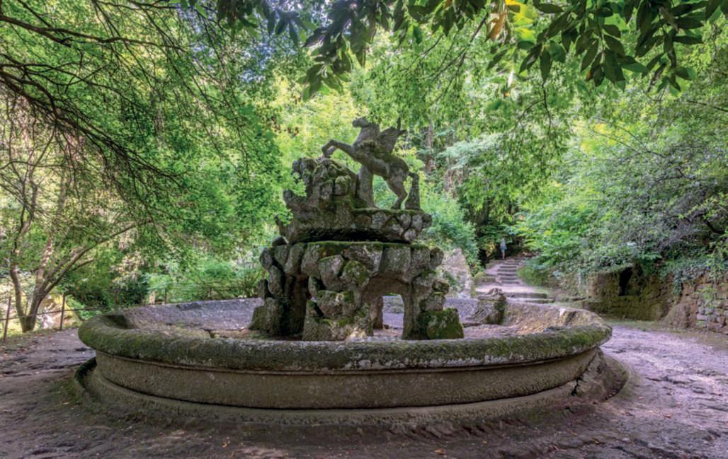 Nelle foto della pagina di destra,inalto,la Fontanadi Pegaso,originariamente circondatadallenoveMuse, purtroppotrafugate nel corso deltempo.Igruppidella TartarugaediPegaso sembranoindicare le famiglie de’MedicieFarnese,amichee alleatedegliOrsini. Nellafotoinbasso,un dettagliodelparco. FotodiDarioFusaro ArchivioGrandiGiardiniItaliani