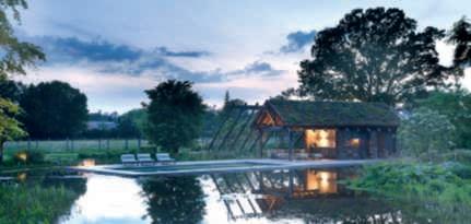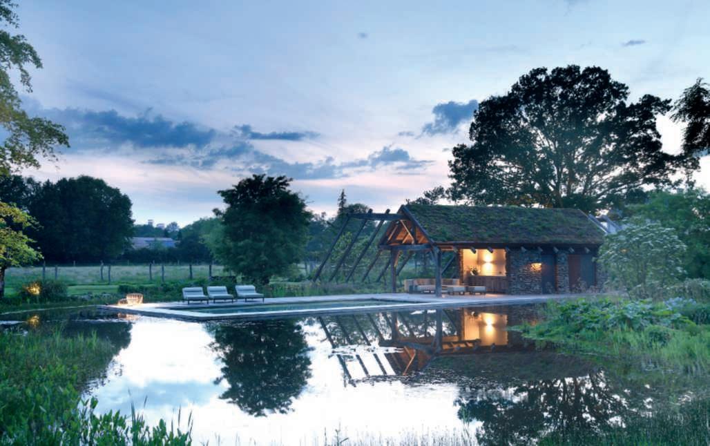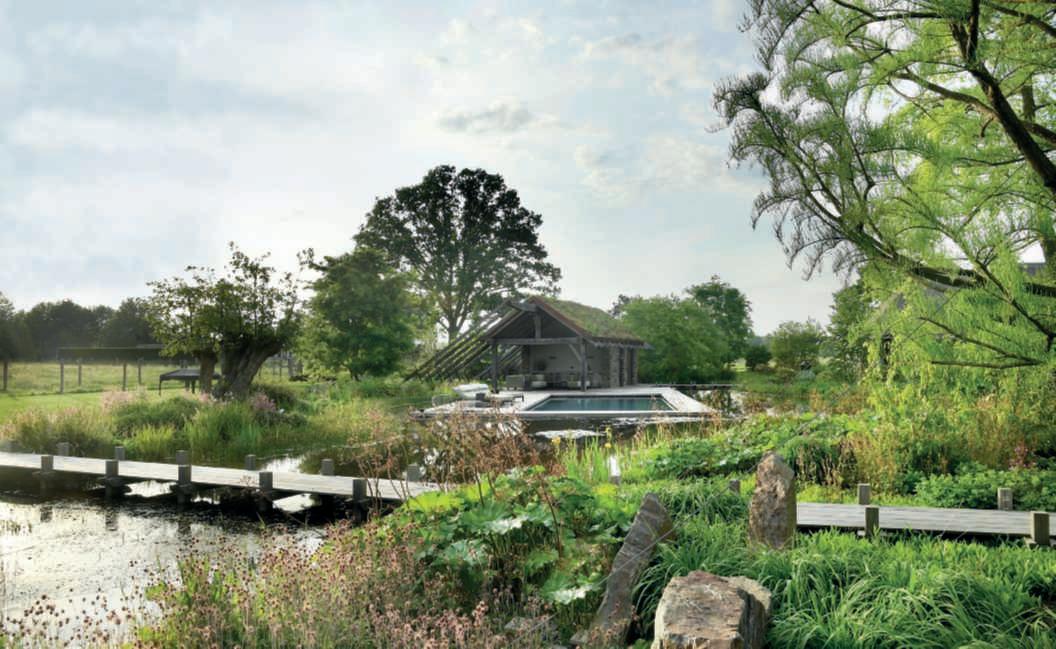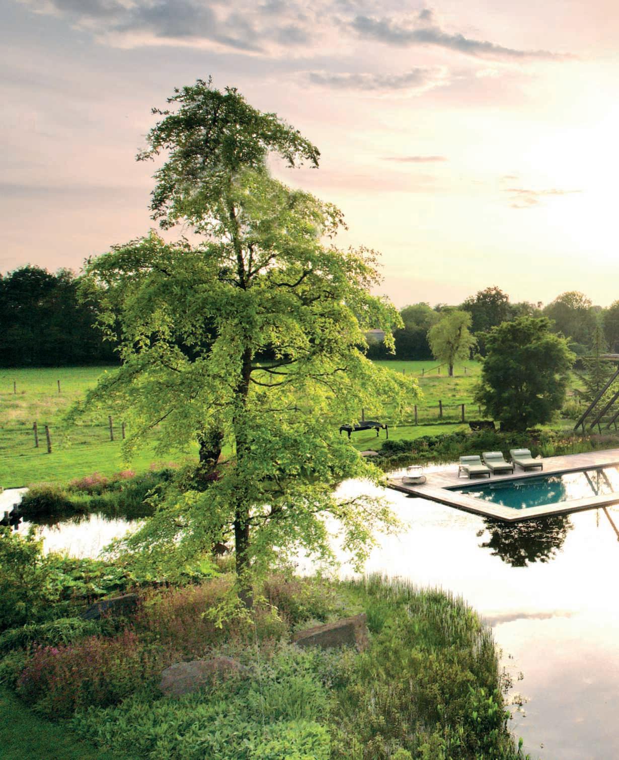 Nellafotodiquestepagine, unavistaparzialedell’oasidi naturalezzaricreata,affacciata sullacampagnadiunariserva protetta.Sinotanoil biolago all’internodelqualeèinserita una piscinatradizionale,la vegetazionesullesponde, la poolhouse esullosfondo unagrandequerciapreesistente,all’esterno deiconfini dellaproprietàmacheviene inglobataotticamente. Ilgiardinoèstatocreatosu unprato prima destinato alpascoloeigrandialberi messiadimoramaturicreano l’illusionediunpaesaggio preesistente
