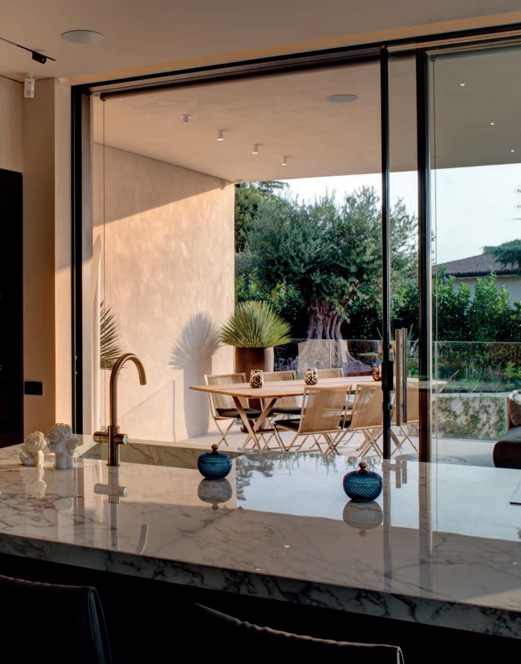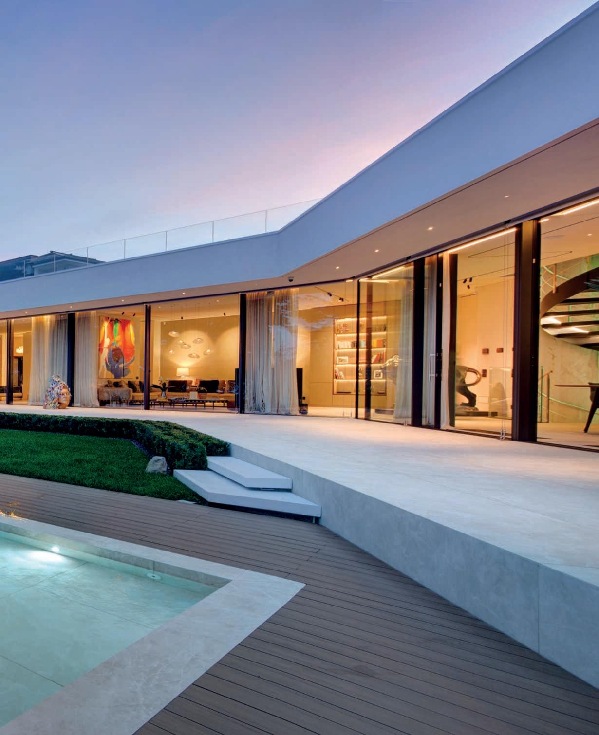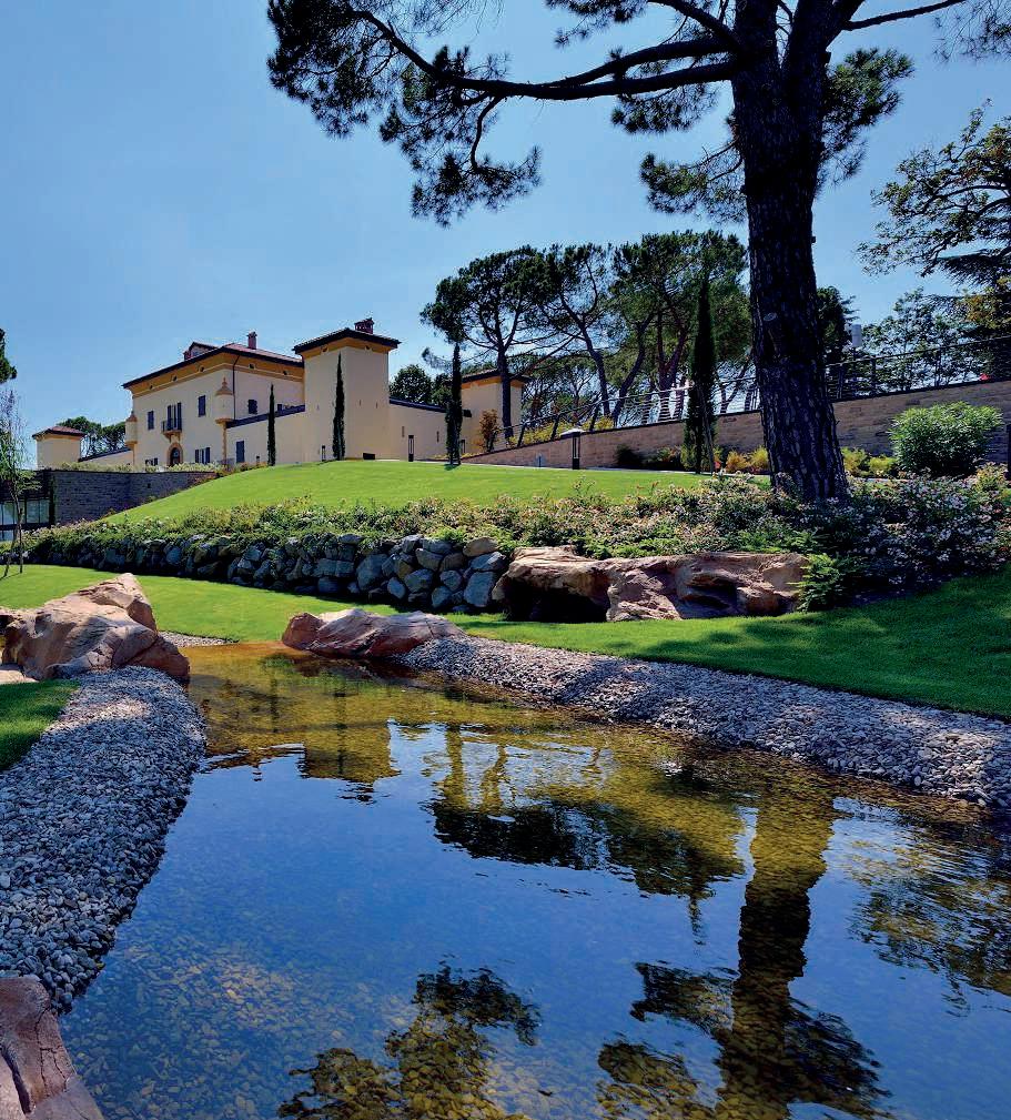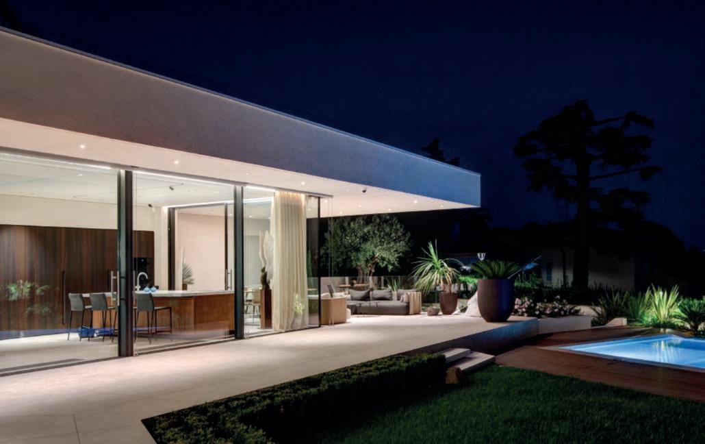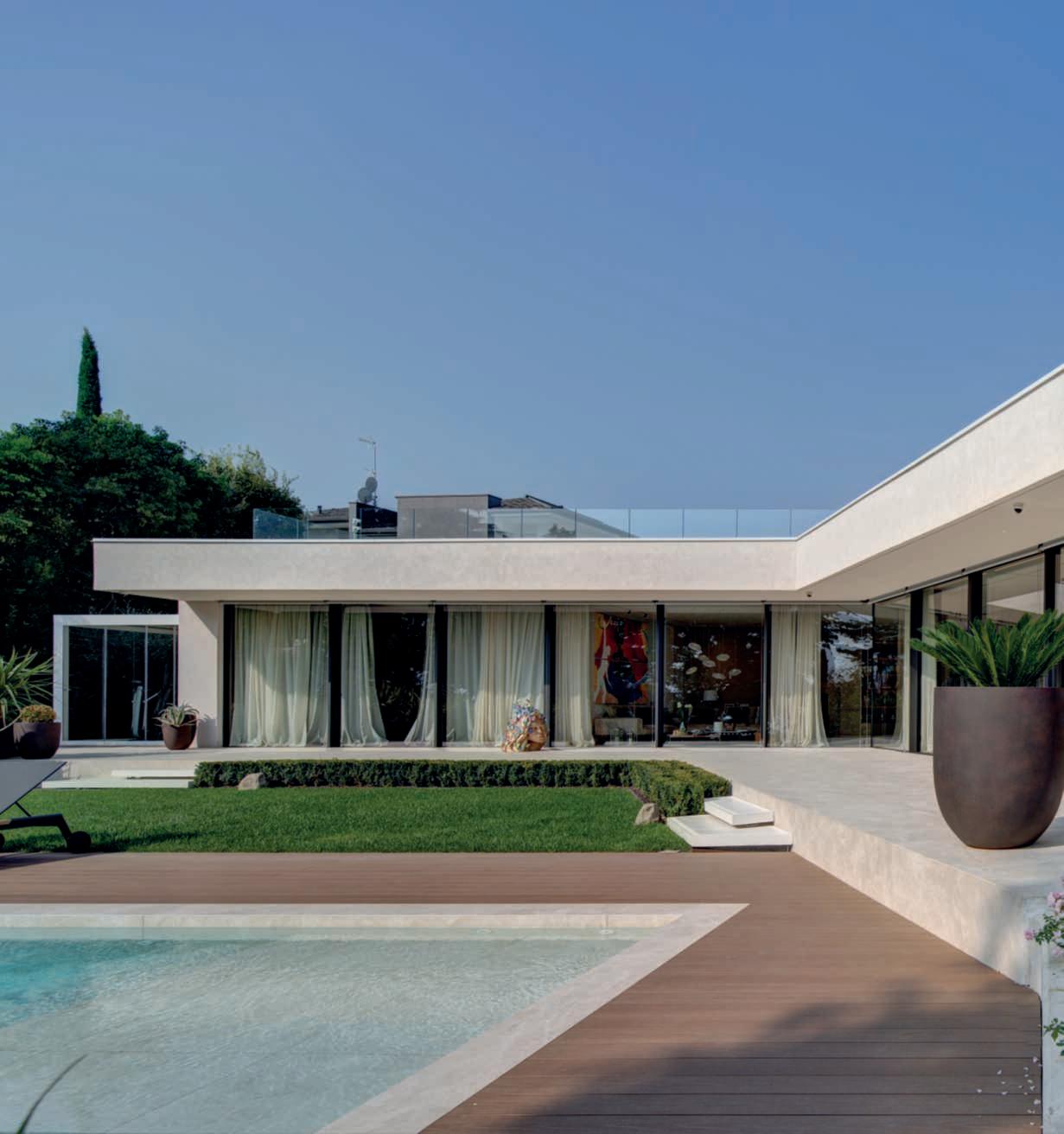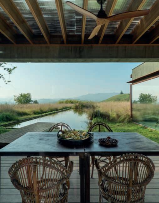 Ilgiardino,chesiestendesuunasuperficiedicircaunettaroedècircondatosutrelatidaunaltroettarodovepascolanoancoraicavalli,allevatinellescuderieall’internodella proprietà,èstatoprogettatoperviverea360°lanaturaesi sviluppaprincipalmentesullatoposterioredellavilla,dove sonolezoneliving,caratterizzatedagrandivetratechesi apronosulpaesaggio,consentendo,durantelabellastagione, uno stile di vita outdoor indoor. Ungrandebiolagodalleformesinuosedominaunavasta partedell’area,nediventailpuntofocaleedècaratterizzatodallapresenzaalsuointernodiunapiscinatradizionale.Èunasoluzioneibrida,resanecessariadalleescursioni termichedellazonachedurantelanottefannoscendere diparecchiolatemperaturadell’acqua,chesiassesta,duranteilgiorno,intornoai18-19°C,rendendoilpiacere difareunanuotatanelbiolagounasceltacoraggiosa.In questomodo,invece,chinuotanellapiscinatradizionale