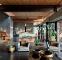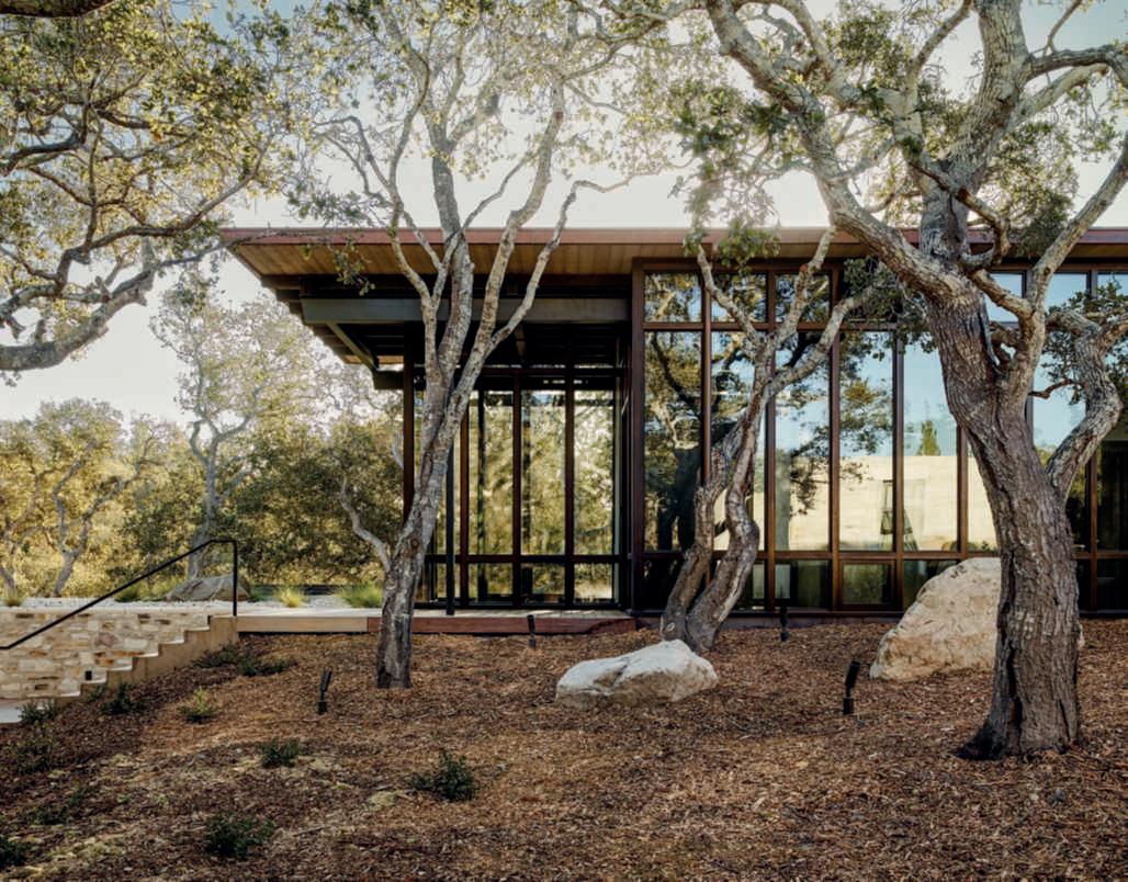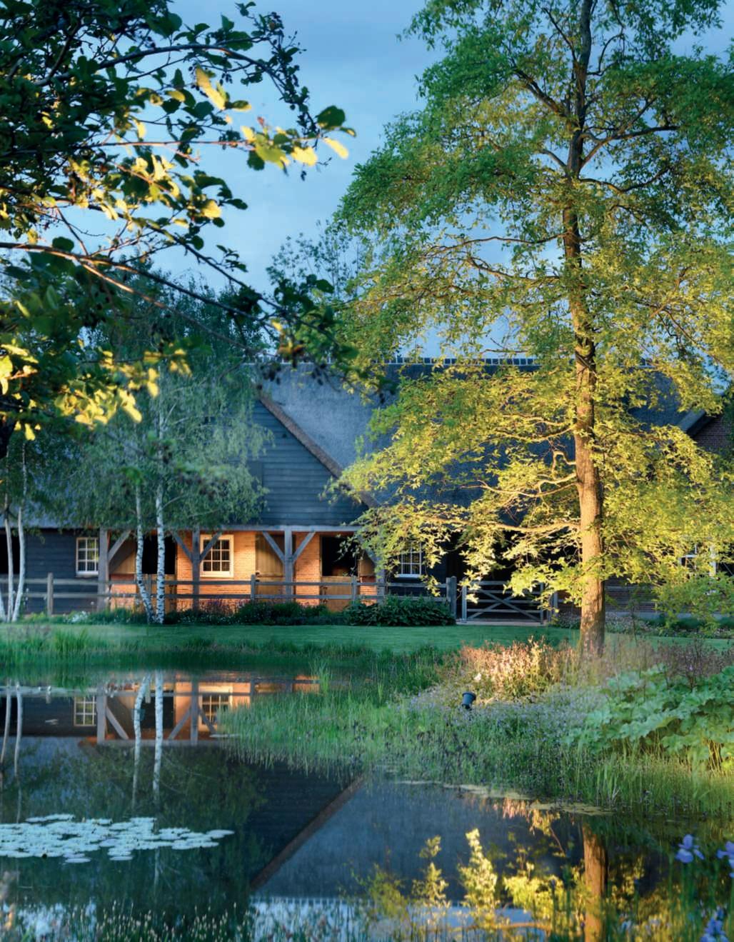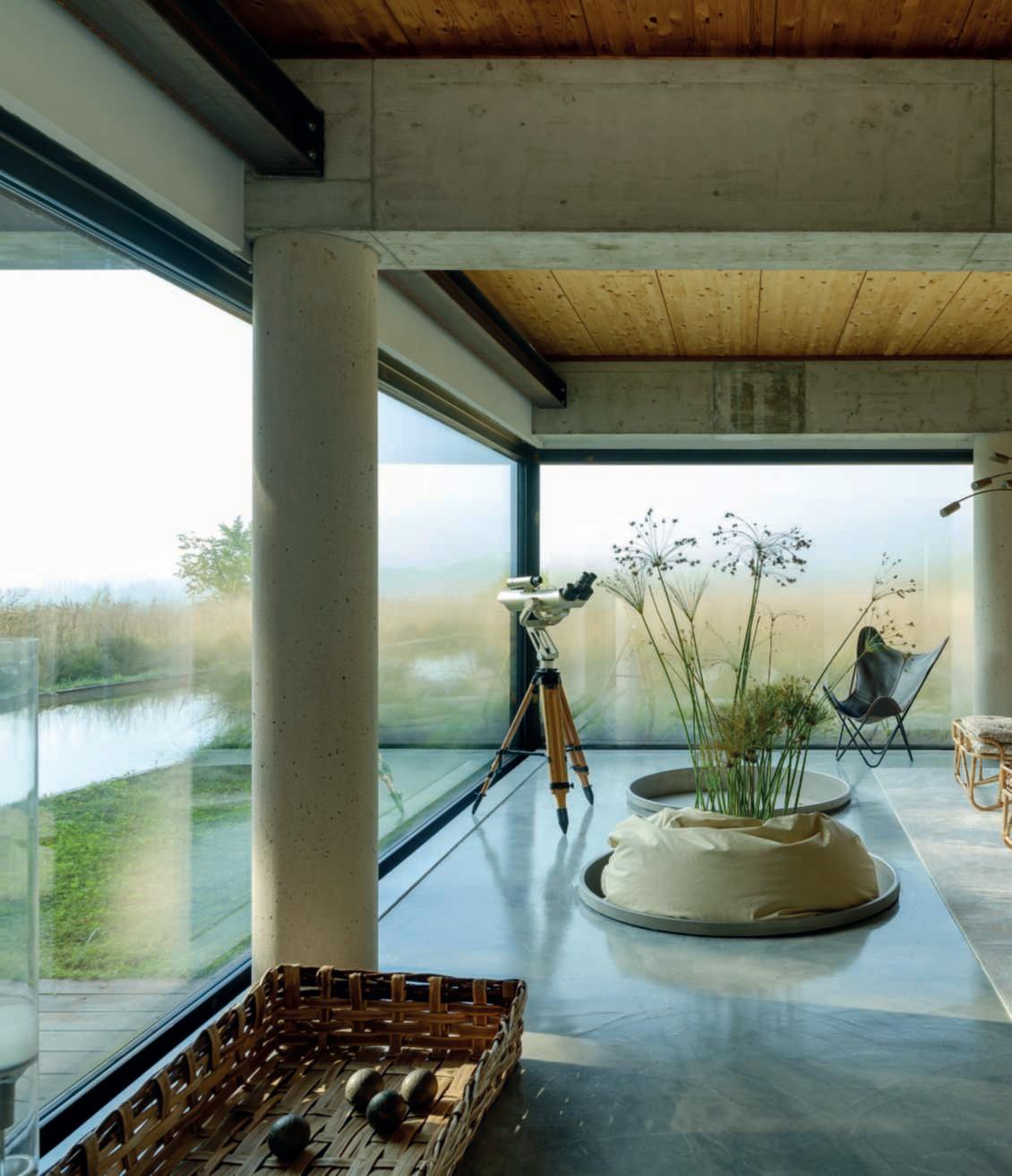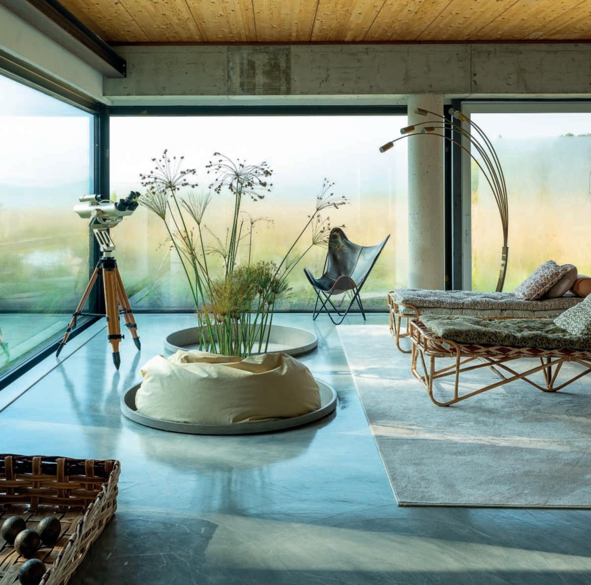 Ilgiardino,chesiestendesuunasuperficiedicircaunettaroedècircondatosutrelatidaunaltroettarodovepascolanoancoraicavalli,allevatinellescuderieall’internodella proprietà,èstatoprogettatoperviverea360°lanaturaesi sviluppaprincipalmentesullatoposterioredellavilla,dove sonolezoneliving,caratterizzatedagrandivetratechesi apronosulpaesaggio,consentendo,durantelabellastagione, uno stile di vita outdoor indoor. Ungrandebiolagodalleformesinuosedominaunavasta partedell’area,nediventailpuntofocaleedècaratterizzatodallapresenzaalsuointernodiunapiscinatradizionale.Èunasoluzioneibrida,resanecessariadalleescursioni termichedellazonachedurantelanottefannoscendere diparecchiolatemperaturadell’acqua,chesiassesta,duranteilgiorno,intornoai18-19°C,rendendoilpiacere difareunanuotatanelbiolagounasceltacoraggiosa.In questomodo,invece,chinuotanellapiscinatradizionale