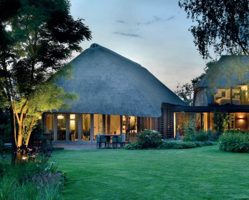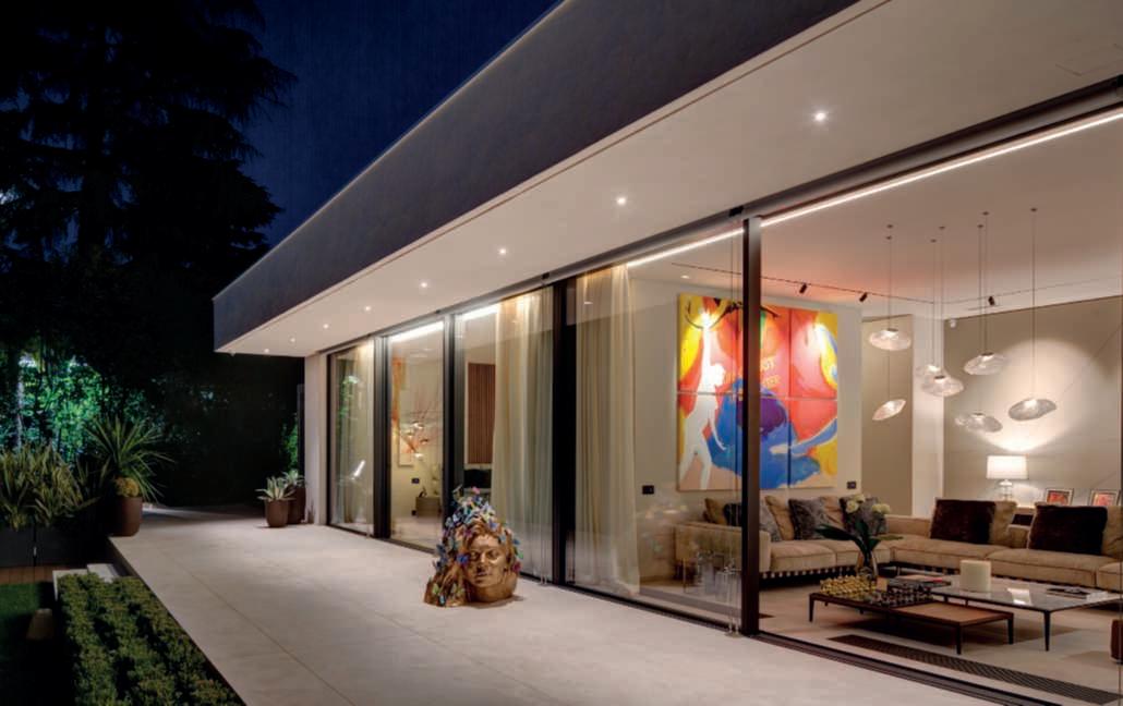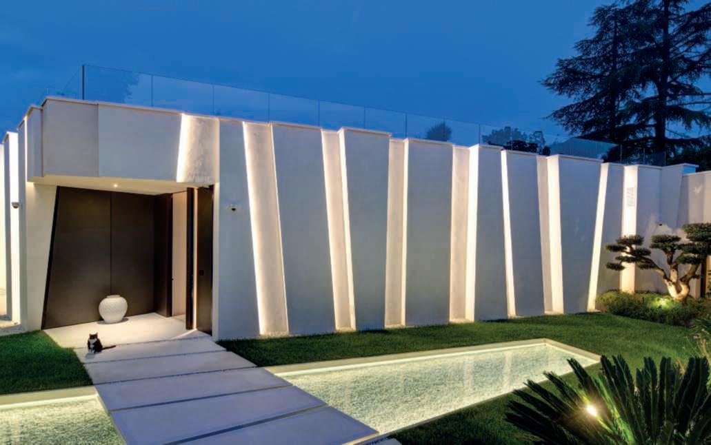 Nellefotodiquestepagine, viste del giardino, della villa e delle scuderie a tardasera, illuminatida lucidiatmosfera soffuse,perdarerisaltoagli alberi e agli edifici. Nella zona solariumdellapiscinasinotano i tavolini luminosi Meridiano di Vibia