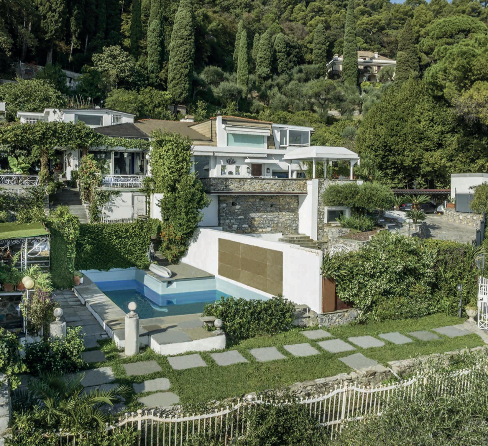 Nellafotodiquestepagine, unavistadel biolago,dei ponticellicheconsentonodi attraversarlo,dellapiscinacon lazonasolarium, della pool house e di una partedellavilla. In primo piano a destra Geum
