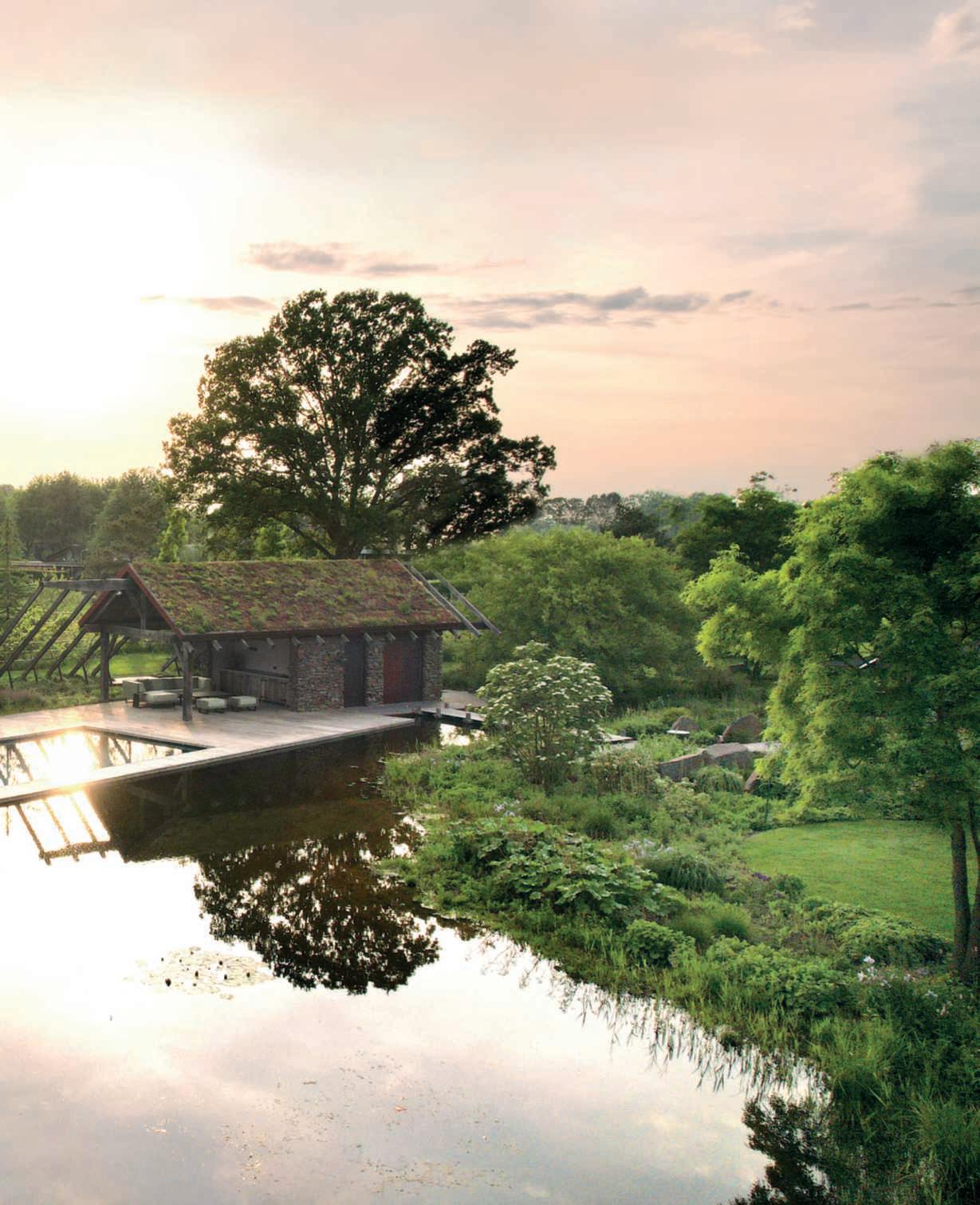 Nelle foto della pagina di sinistra,inalto,una vistadel giardinodalsolarium, con le betulle,i Taxodiumdistichum var.distichum e le Staphylea pinnata che si riflettono nell’acqua,lariccavegetazione all’interno del lago e nelle bordure;inbasso,undettaglio con Taxodiumdistichum var. distichum, Alchemillavulgaris, Succisella inflexa, Molinia arundinacea‘Transparent’ e Geumrivale.Nellefotodi questapagina, in alto una vista del biolago e della piscina, sullosfondodelgiardinoche siperde nel paesaggio.In primopiano,tralerocceche sembranoaffiorarenaturalmente, Geumrivale, Darmera peltatae e Moliniaarundinacea ‘Transparent’; in basso,una vistadellapiscina,dellazona solariumedellapoolhouse, con il tettorivestitoconverde pensileestensivopercollegare lacostruzionealpaesaggio.