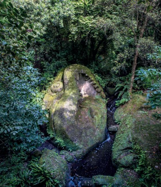 Nella foto di queste pagine una dellesculturesimbolodel Sacro BoscodiBomarzo:ilgruppo Proteo,secondolaricostruzione classica, poichéogniscultura puòavere più significatia secondadell’interpretazioneche gli storici hanno voluto attribuire aquesto enigmatico luogo e alle operechelopopolano.Questa scultura è stata immortalata nei disegni di GiovanniGuerra nel 1604,unadelleraretestimonianzedell’epocaimmediatamentesuccessivaalla costruzione del parco giunte fino a noi. Situatosullato ovest del giardino, è una testa mostruosa davantiaunacollinaeinparte circondata dalla vegetazione; l’enorme Proteo è una figura dellatradizioneedella