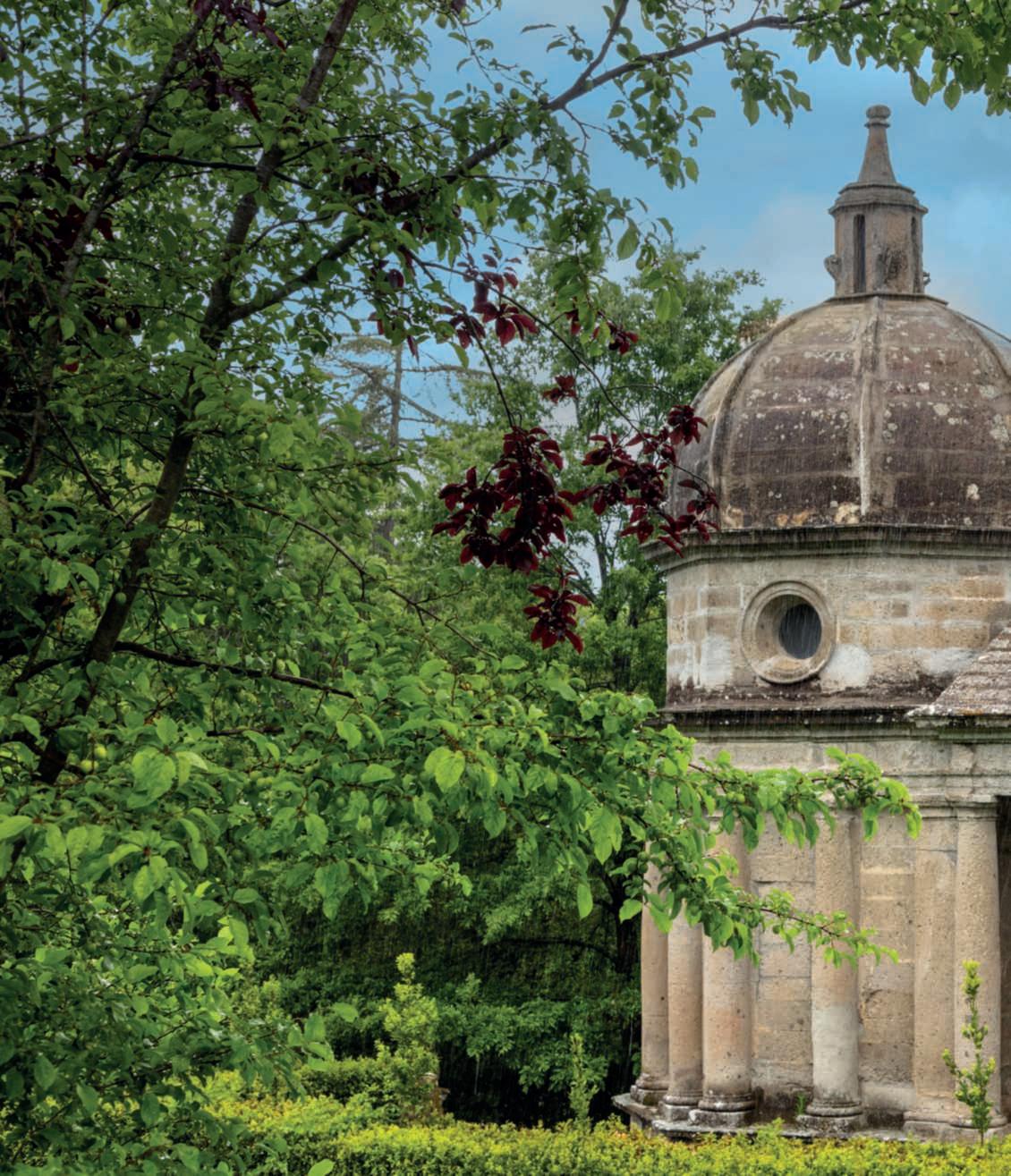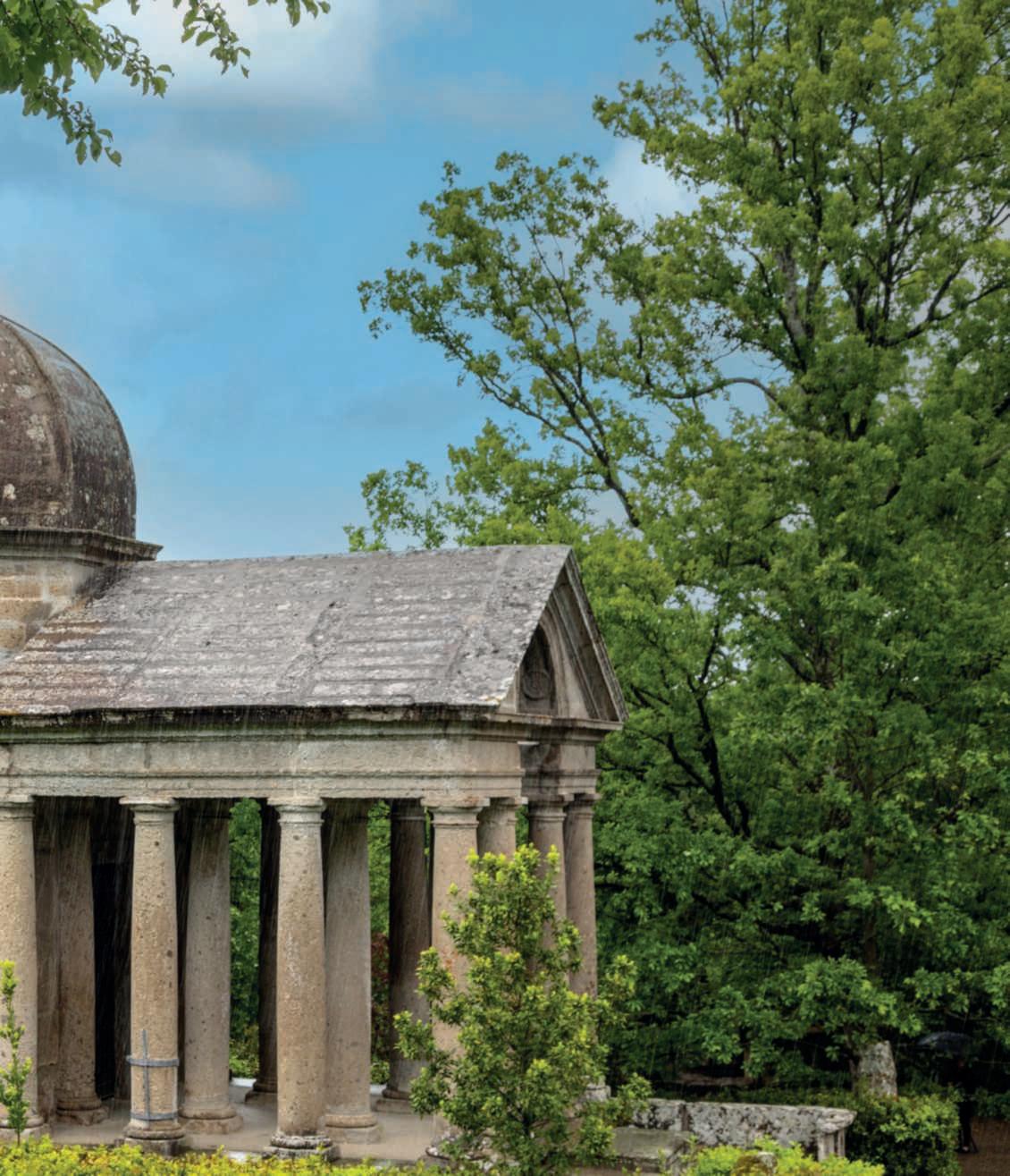 Nella foto di queste pagine,l tempietto Apiantaottagonale e conunacupolachericordaquella del Brunelleschi, è l’unica opera costruitaappositamente,enon ricavatadallaroccia.Siritienesia stato dedicatodaVicinoOrsinia GiuliaFarnese elìriposanoi coniugiBettini, i due artefici della restituzione al mondo delSacro BoscodiBomarzorestaurato,per condividere questo gioiello che tuttoilmondoinvidia,primoepiù importante Folly esistente.