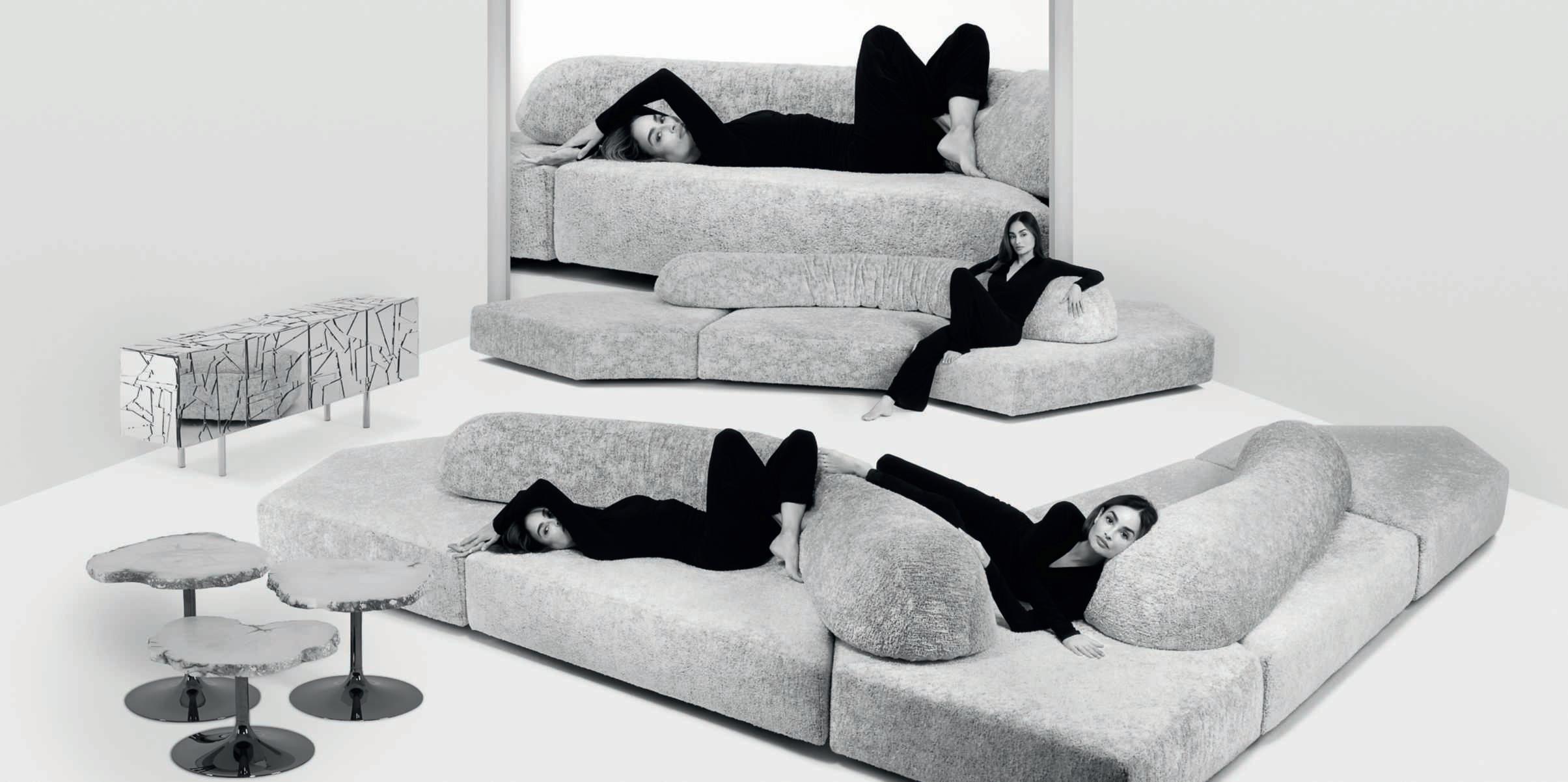 Divano,poltronaepoufdella collezione PebbleRubble disegnata daSofia Lagerkvist e AnnaLindgren diFront Design. Unapropostacaratterizzata dalleformeorganichedegli elementi di base,ispiratea quelle di grandisassi. Completanol’ambientazione iltappeto Sama inlanae viscosa,disponibileinquattro colorinaturaliton-sur-tone iltavolino Cloud diNendo, conpianoinacciaotraforato a forma ovoidale irregolare. Ilprodottoèdisponibilein setdatrepezzididimensioni diverse.