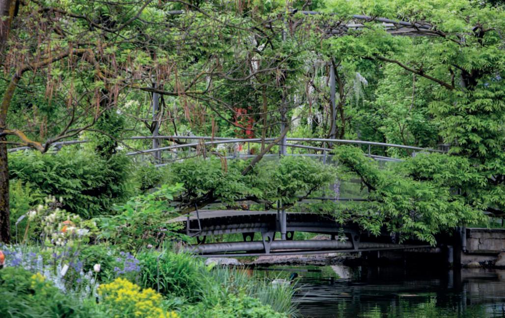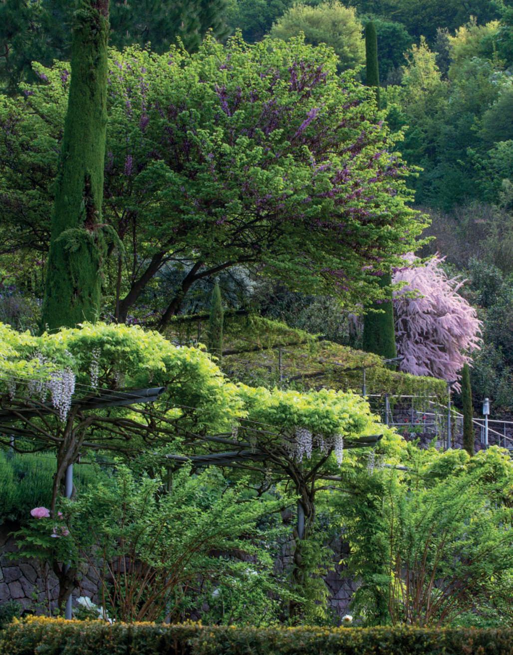 In questapagina, vista di una pergola con glicini giapponesi, vicino a un Cercis siliquastrum, sullo sfondo la fiorituraspettacolarediuna Tamarixramosissima.Nella paginadi sinistra, vistedel Laghetto delle Ninfee;in alto,una passerella sull’acqua, dovesono visibili i fiori diloto ( elumbo nucifera), sulle rive i Trachycarpus fortunei; in basso, un ponte sullago