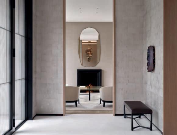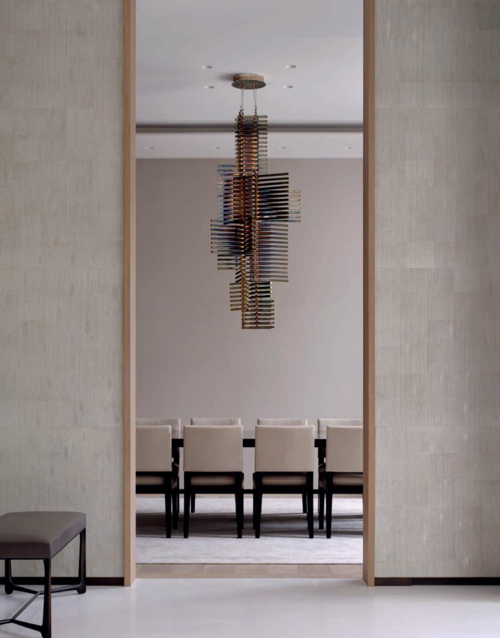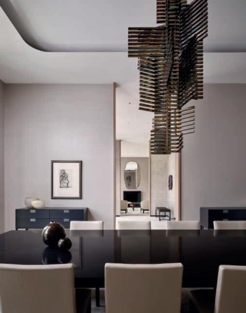 Ontheleftpageandon thispage,above,theformal diningroom Chandelier by VincenzoDeCotiis, Luna chairs by HollyHunt and custom table by Burdiflek Inthecorridor, XYbench by HollyHunt.Ontheleft,the staircaseleadingtotheupper foor oundli ht Bulbtable by EricSchmitt for Ralph Pucci.Above,theentrance to the second foor, eaturin a 3-dimensionalsculptural piece by DennisLin anda customstone sideboard by Burdiflek
