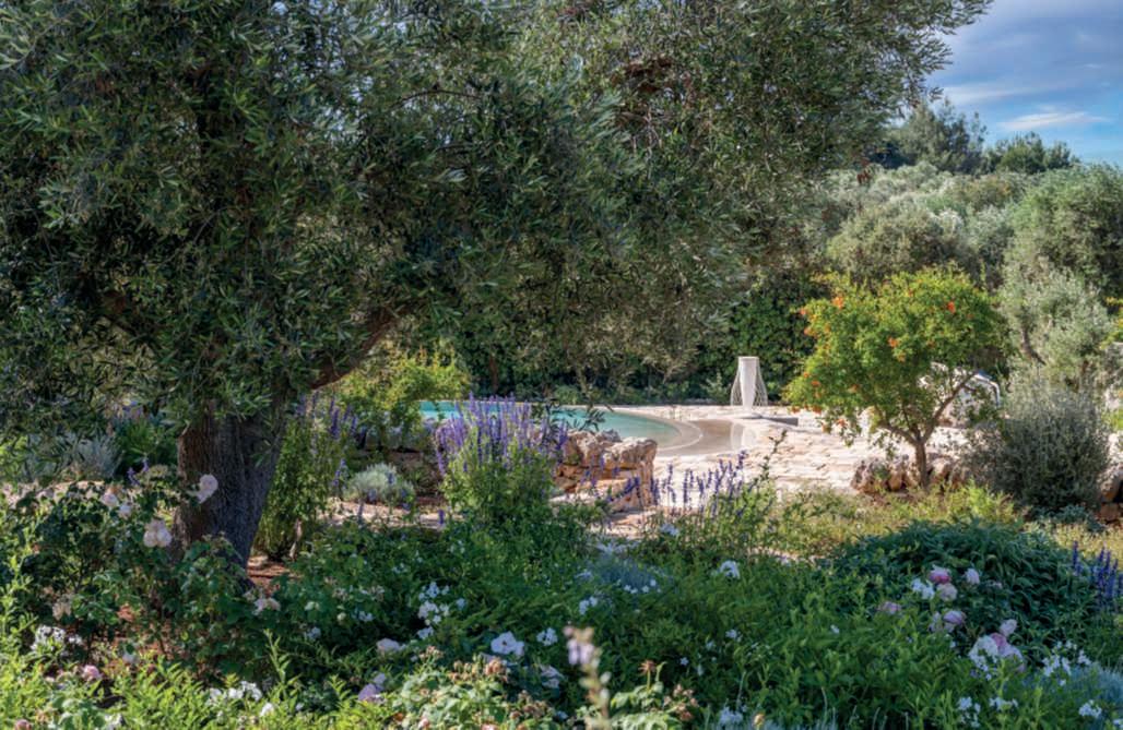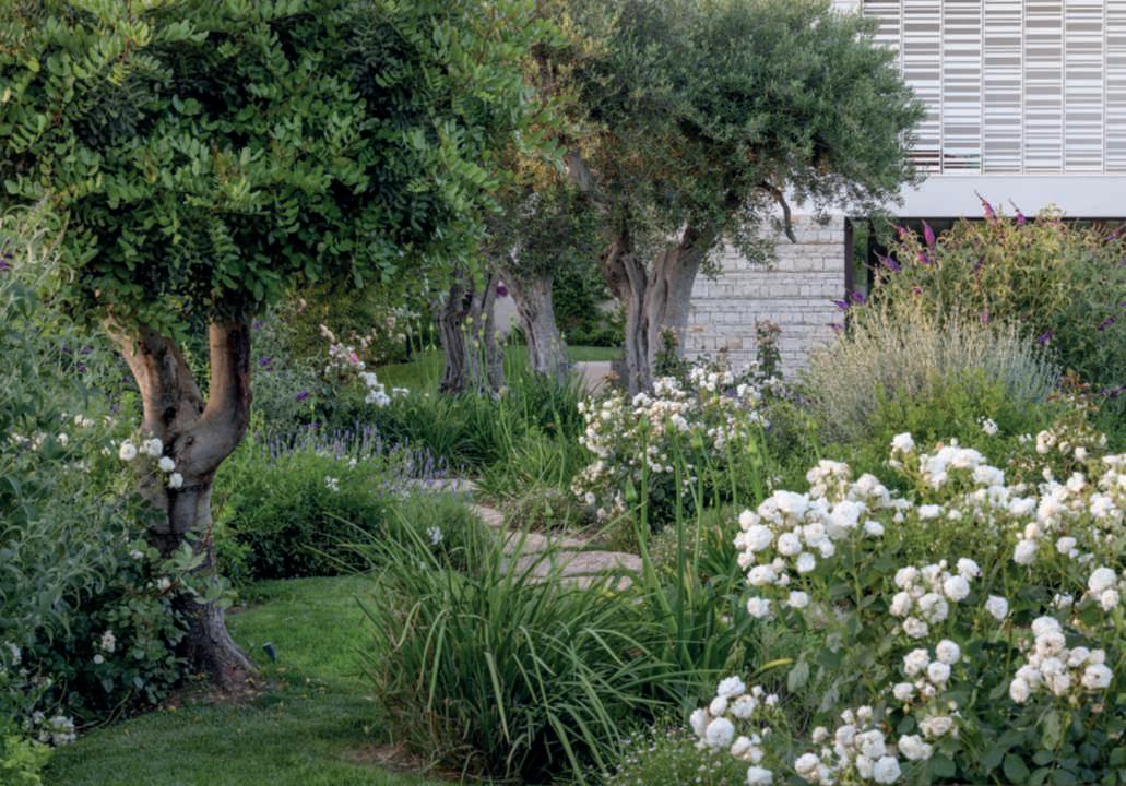 “Theownerswantedagardenrichinsoberandelegantcolours,changingwith theseasons.So,IchoseTeucriumfruticans,Buddlejadavidii,lavenders,ornamentalsalvias,mastic,andDavidAustinEnglishRoses,alongwitharomatic plantsthatgivethegardenanintoxicatingfragranceconducivetomeditation anddeepthoughts.Thegardenmustindeedsatisfyallthesenses,andthisis alwaysmygoalwhendesigning”.Thecushion-likegrowthhabitoftheplants, thedifferentleaftextures,theshapesandcoloursoftheflowers,andthealternating shades of green create a captivating play of harmonies. Thedecision to plantMediterraneanspecies,whichrequirelittlewater—anessentialfactorin aregionwherewaterisapreciousresource—withlongbloomingperiodsand elegantformswascrucialincreatinganelegantandbalancedgardenthatperfectly dialogues with the architecture.