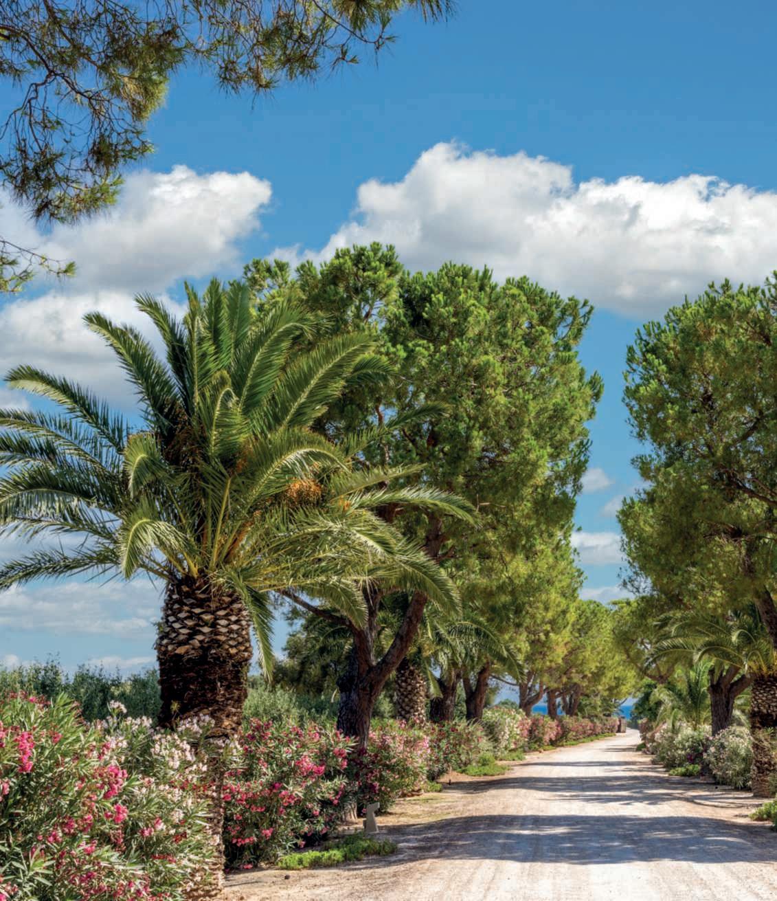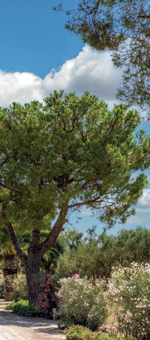 On these pages,the pathway leadingtooneofMasseria SanDomenico’stwoprivate beaches,flanked by Phoenix canariensis, Pinuspinea,and oleanders,whichprovidea naturalbarrierseparatingthe surrounding olivegroves