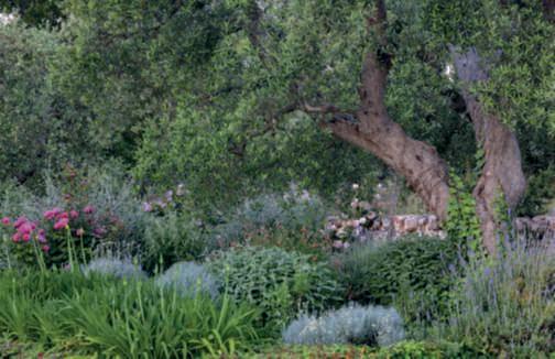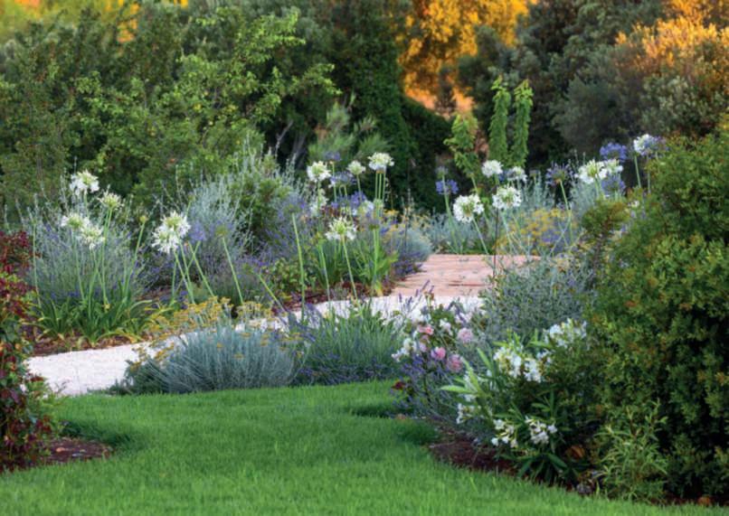 In queste pagine e nelle successive,le bordure che fiancheggiano i camminamenti che poco a poco svelano il giaridno a chi li percorre. GianniBirardi ha sapientemente ripetuto l’uso delle piante, accostandole in combinazionidiverse.Piccoli lentischi, Teucriumfruticans, Buddlejadavidii, Solanum jasminoides ‘Album’, lavande, Helichrysumitalicum e Agapanthus fanno capolino tra olivi e carrubi