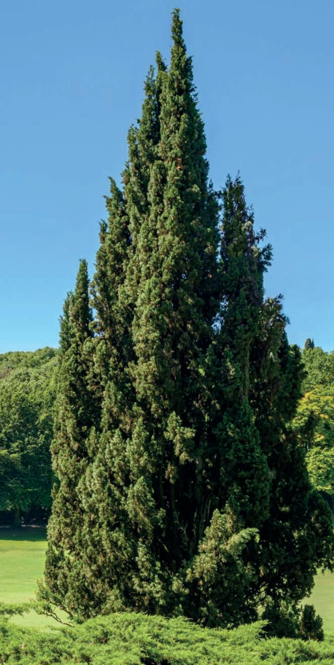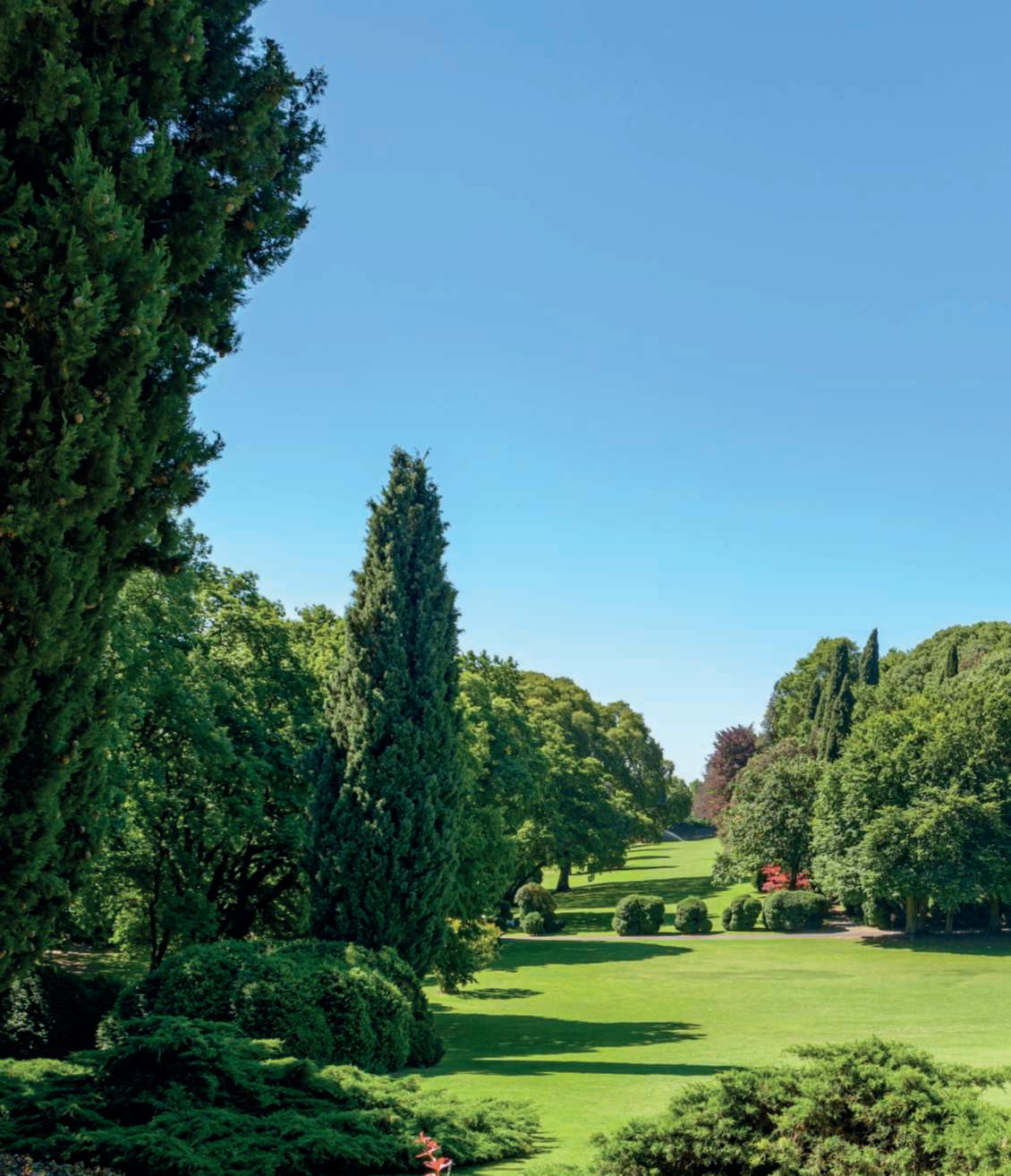Nellafotodiquestepagine, vistadall’Eremodiunadelle grandiradure,conimaestosi alberi,cheproiettanoleloro ombresultappetoerboso,e ungruppodibossilungoun sentiero.QuelladelParco GiardinoSigurtàè lacollezionedibossipiùriccaal mondo cheannovera 40.000 piante, abilmente potatedai giardinieri. FotoArchivioParcoGiardino Sigurtà.