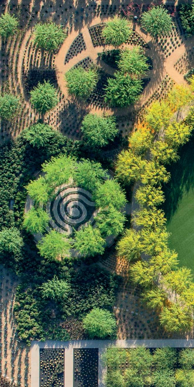 Nellafotodiquestepagine, unavistadall’altoche consente di abbracciare in unsolosguardo ilgiardino posteriore, con i trecerchi del labirinto,delgrandeprato centrale, coi i fiorellini gialli cadutidelle Parkinsonia x ‘DesertMuseum’,ediquello piùpiccolo,i percorsi e le aiuolegeometrici,igruppi monospecifici di piante,gli alberi e le aiuole rettangolari con le piante esemplari del deserto. Sinota l’ampia palette deiverdi.