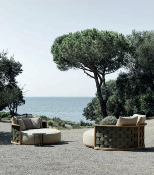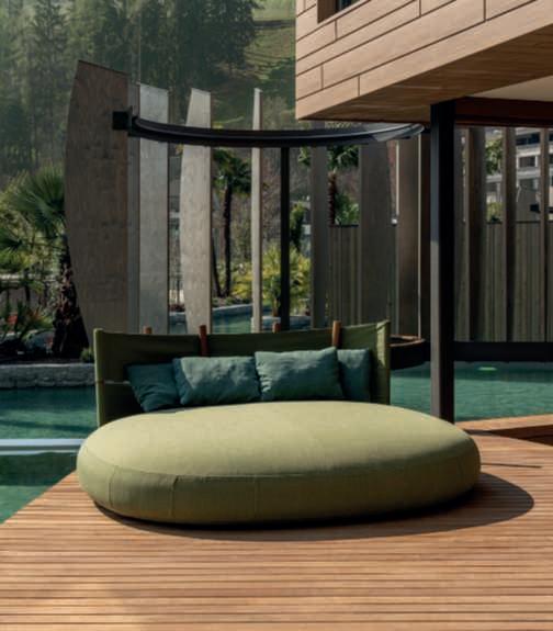 Lacollezioneoutdoor Briccola firmatada MarcelloZiliani,si ispiraaipaliinlegnodiVenezia.Loschienaledelcomodo daybed è composto da un ventagliodi“briccole”inIroko legatedafasceditessuto.