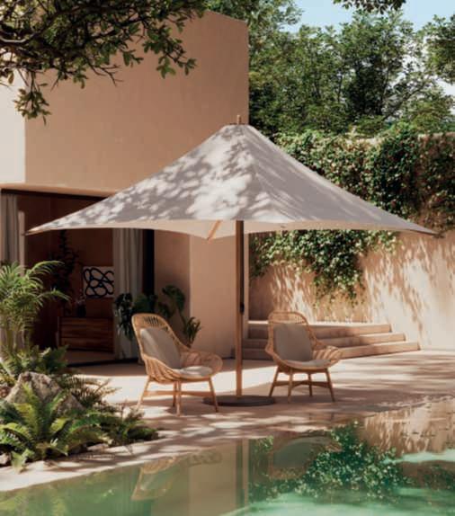 Paladin èunombrellonedel designerKonstantinGrcic. La tela sembragalleggiare elegantemente,sorrettada quattropuntonimobilisull’alberocentraleinteaknaturale conanimainalluminio.