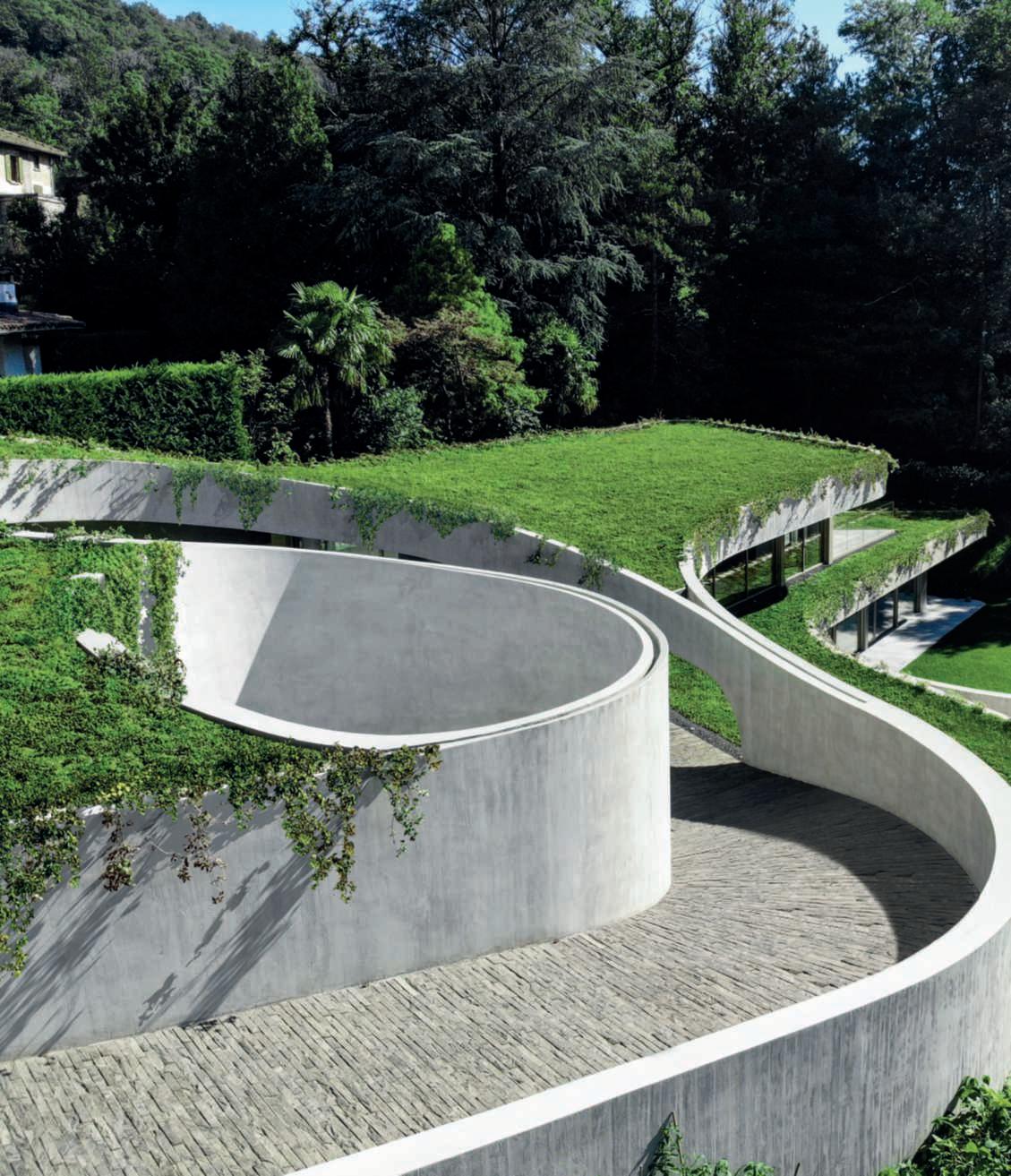 Leformesinuosealleggerisconolastrutturascultoreadefinita dal cemento armatoavistae la composizioneaterrazze dei pianipermettela realizzazionedicopertureverdi incui la vegetazione ricoprebuona parte del frontesottostante. Un rifugio artificialedalle sembianzenaturali,l’architettura silegaalpaesaggio con l’uso dimaterialigrezziplasmatie modellatiperseguiresinuosamente le curve di livello.